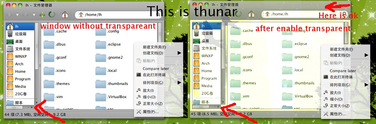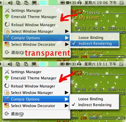 Created attachment 26968 [details] xfce4-note-plugin with and without transparent i am using archlinux, compiz-git kernel26-git from linus' git tree, mesa-git from master branch, libdrm git from master branch, xf86-video-ati-git from kms-support branch just like airlied's blog wrote, the KMS seems work very well with X. all above have updated just now. hardware: X700 mobility (M26) Problems: when some apps enable transparent(like xfce4-note-plugin, gimp tool panel), the whole window turn to very white. and use mouse wheel to transparent one application will get the same problem see the screenshoot, but not every application, QT, terminal, tilda etc will be ok. when enable popup menu's transparent, the separater also turn white and can't see it clearly. but other part of menu are all right. and the menu in QT apps (qtconfig, opera) and GTK apps with RGBA support (xfce4-terminal, tilda) will be better. but the problem only happen when using compiz, not happen if i use composite provited by xfwm. if i not select "indirect rendering" in fusion-icon, it will have no such problem either, but with kernel26-git, it's too slow, and every action stop for a while. i have to let it selected. And of course without KMS all things are fine.