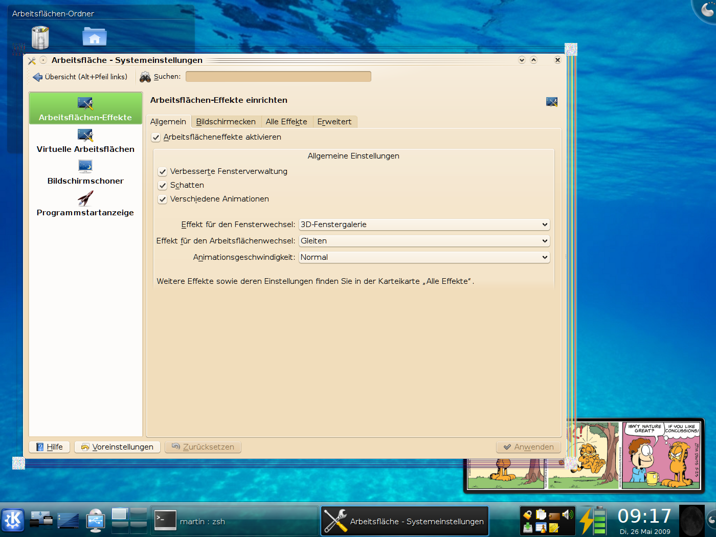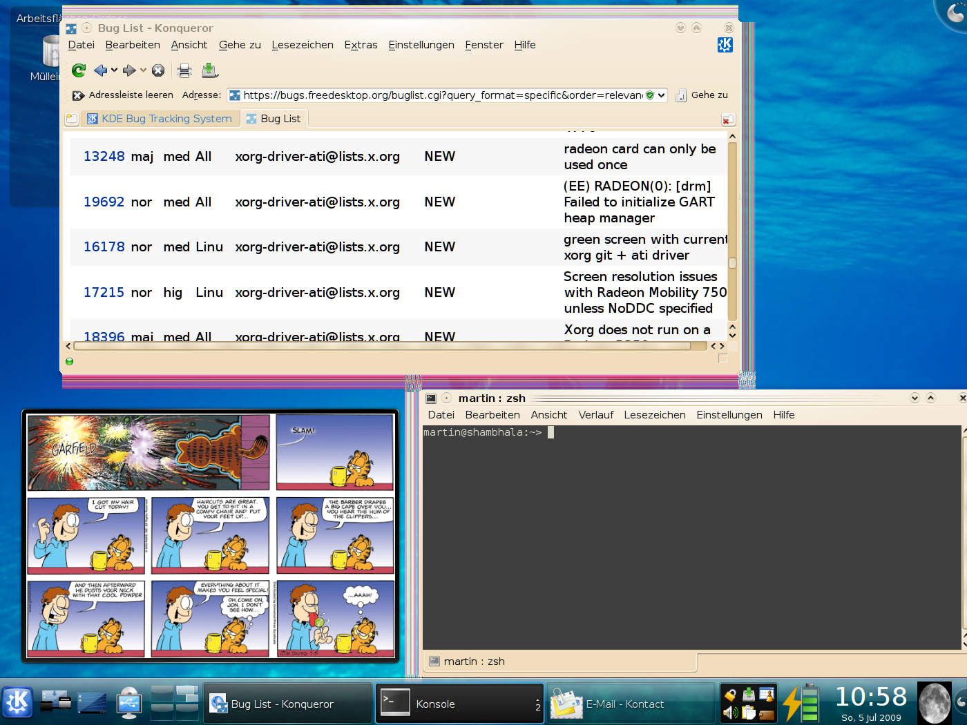 Created attachment 27387 [details] X.org configuration file After resume from suspend to ram or suspend to disk using TuxOnIce there is graphics garbage around window borders. It goes away when I start systemsettings, untick the checkmark for activating desktop effect, tick it again and press "Apply". It also goes away when I disable compositing and re-enable it again afterwards. I did not see other malfunctions, just the graphics corruption while compositing is still working after resume. I don't know whether DRI is the approbiate place to report this against. I do not even know whether it might be a KDE 4 kwin problem instead. But I had to start somewhere. This is happening on an IBM ThinkPad T42 with radeon chipset: martin@shambhala:~> lspci -nn | grep VGA 01:00.0 VGA compatible controller [0300]: ATI Technologies Inc RV350 [Mobility Radeon 9600 M10] [1002:4e50] Using XOrg CVS as 7.4 is not in the version list. I use the following on a mixture of Debian Lenny/Squeeze/Sid/Experimental: martin@shambhala:~> apt-show-versions | egrep "(libgl1-mesa-dri|xserver-xorg-video-radeon|xserver-xorg/|xserver-xorg-core/)" libgl1-mesa-dri/sid uptodate 7.4.4-1 xserver-xorg/sid uptodate 1:7.4+3 xserver-xorg-core/sid uptodate 2:1.6.1.901-3 xserver-xorg-video-radeon/sid uptodate 1:6.12.2-2 xserver-xorg-video-radeonhd/sid uptodate 1.2.5-1 (I made sure that X.org and Mesa related packages are consistently at Sid.) I am using radeon driver. I attach my xorg.conf. I also attach two screenshots that demonstrate the problem. Regarding my xorg.conf: I am using XAA, since X.org tends to use 99% CPU with EXA. Yes, I know glxgears is not a benchmark. I am using CONFIG_FB_RADEON. My current kernel is: martin@shambhala:~> cat /proc/version Linux version 2.6.29.2-tp42-toi-3.0.1 (martin@shambhala) (gcc version 4.3.3 (Debian 4.3.3-3) ) #2 PREEMPT Tue Apr 28 22:08:44 CEST 2009 I do not yet use 2.6.30 since it reboots after resuming from TuxOnIce hibernation. I am building a new kernel with 2.6.30.1 and some TuxOnIce fixes that might work tough. I will report when it works and it makes any difference. Please tell me when you need anything more.
