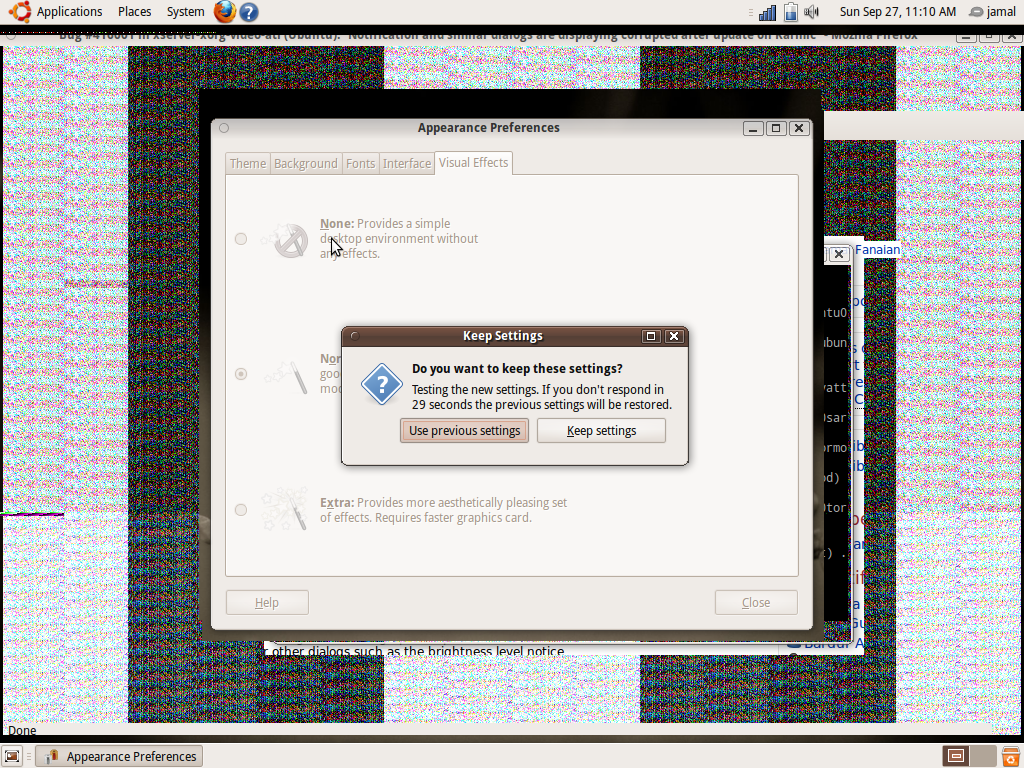 Forwarding this bug from Ubuntu reporter Jamal Fanaian: http://bugs.launchpad.net/ubuntu/+source/xserver-xorg-video-ati/+bug/416001 [Problem] Notification dialogs are showing white lines (see screenshots) [Original Description] Ubuntu release: Karmic 9.10 xserver-xorg-video-ati version installed: 1:6.12.99+git20090629.f39cafc5-0ubuntu6 After updating last night, notification dialogs are showing up corrupted (white with lines around it). The same is happening for other dialogs such as the brightness level notice that is displayed when the laptop is unplugged. Gnome-do also appears the same way. Also, when logging in the entire screen will go white with lines for a few seconds and then go back to showing the orange background from the login screen. I have attached some screenshots of the issue. Architecture: i386 Date: Wed Aug 19 12:01:26 2009 DistroRelease: Ubuntu 9.10 Lsusb: Bus 003 Device 001: ID 1d6b:0001 Linux Foundation 1.1 root hub Bus 002 Device 001: ID 1d6b:0001 Linux Foundation 1.1 root hub Bus 001 Device 001: ID 1d6b:0001 Linux Foundation 1.1 root hub MachineType: IBM 236686U Package: xserver-xorg-video-ati 1:6.12.99+git20090629.f39cafc5-0ubuntu6 ProcCmdLine: BOOT_IMAGE=/boot/vmlinuz-2.6.31-6-generic root=UUID=496c6fa3-f6d3-4a5a-9a77-ccf1d1d29679 ro quiet splash ProcEnviron: LANG=en_US.UTF-8ProcVersionSignature: Ubuntu 2.6.31-6.25-generic RelatedPackageVersions: xserver-xorg 1:7.4+3ubuntu5 libgl1-mesa-glx 7.5-1ubuntu1 libdrm2 2.4.12-1ubuntu1 xserver-xorg-video-intel 2:2.8.0-0ubuntu2 xserver-xorg-video-ati 1:6.12.99+git20090629.f39cafc5-0ubuntu6 SourcePackage: xserver-xorg-video-ati Uname: Linux 2.6.31-6-generic i686 XorgConf: Section "ServerFlags" Option "DontZap" "False" EndSection dmi.bios.date: 06/11/2004 dmi.bios.vendor: IBM dmi.bios.version: 1IET69WW (2.08 ) dmi.board.name: 236686U dmi.board.vendor: IBM dmi.board.version: Not Available dmi.chassis.asset.tag: No Asset Information dmi.chassis.type: 10 dmi.chassis.vendor: IBM dmi.chassis.version: Not Available dmi.modalias: dmi:bvnIBM:bvr1IET69WW(2.08):bd06/11/2004:svnIBM:pn236686U:pvrNotAvailable:rvnIBM:rn236686U:rvrNotAvailable:cvnIBM:ct10:cvrNotAvailable: dmi.product.name: 236686U dmi.product.version: Not Available dmi.sys.vendor: IBM system: architecture: i686kernel: 2.6.31-6-generic
