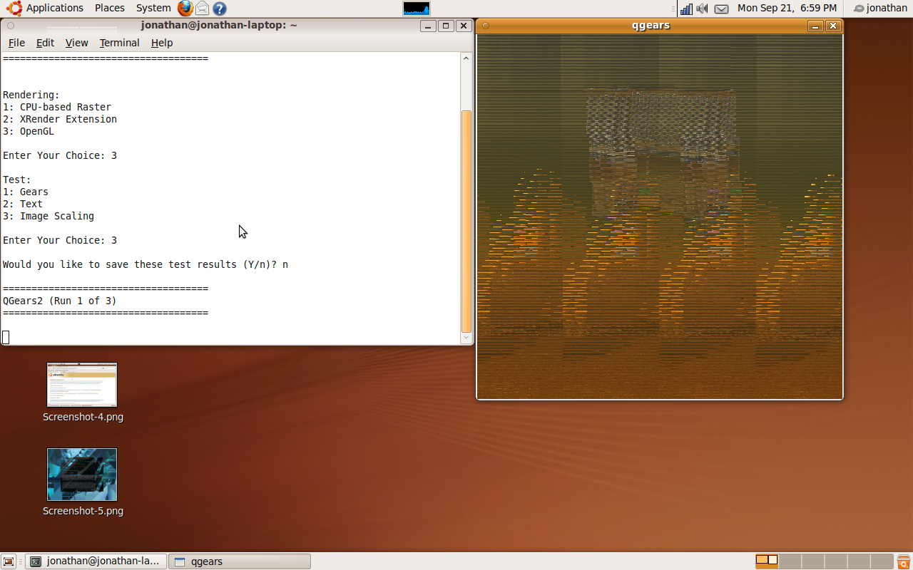 Forwarding a bug from ubuntu user Jonathan Wheare: https://bugs.launchpad.net/ubuntu/+source/xserver-xorg-video-intel/+bug/433974 [Problem] Corrupt textures while running "qgears2" within phoronix test suite when running in opengl mode [Original report] Release: Ubuntu karmic (development branch) x86_64 package installed: 2:2.8.1-1ubuntu1 - xserver-xorg-video-5 issue: Corrupt textures while running "qgears2" within phoronix test suite when running in opengl mode. demo runs normally in xrender and software rendering modes. this test runs normally on my Nvidia based desktop also running karmic. steps to reproduce: 1.Install phoronix-test-suite 2.phoronix-test-suite benchmark qgears2 3.pick option 3. opengl 4.pick option 3. image scaling Architecture: amd64 DistroRelease: Ubuntu 9.10 MachineType: Acer Aspire 5720Z Package: xserver-xorg-video-intel 2:2.8.1-1ubuntu1 PackageArchitecture: amd64 ProcCmdLine: BOOT_IMAGE=/boot/vmlinuz-2.6.31-10-generic root=UUID=68a3128f-f61f-4994-9314-d717846b87f4 ro quiet splash ProcEnviron: SHELL=/bin/bash LANG=en_AU.UTF-8 ProcVersionSignature: Ubuntu 2.6.31-10.34-generic RelatedPackageVersions: xserver-xorg 1:7.4+3ubuntu5 libgl1-mesa-glx 7.6.0~git20090817.7c422387-0ubuntu5 libdrm2 2.4.13-1ubuntu1 xserver-xorg-video-intel 2:2.8.1-1ubuntu1 xserver-xorg-video-ati 1:6.12.99+git20090825.fc74e119-0ubuntu1 Uname: Linux 2.6.31-10-generic x86_64 UserGroups: adm admin cdrom dialout lpadmin plugdev sambashare XorgConf: Error: [Errno 2] No such file or directory: '/etc/X11/xorg.conf' dmi.bios.date: 08/09/2007 dmi.bios.vendor: Acer dmi.bios.version: V1.14 dmi.board.asset.tag: Base Board Asset Tag dmi.board.name: Nettiling dmi.board.vendor: Acer dmi.board.version: V1.14 dmi.chassis.type: 1 dmi.chassis.vendor: Acer dmi.chassis.version: V1.14 dmi.modalias: dmi:bvnAcer:bvrV1.14:bd08/09/2007:svnAcer:pnAspire5720Z:pvrV1.14:rvnAcer:rnNettiling:rvrV1.14:cvnAcer:ct1:cvrV1.14: dmi.product.name: Aspire 5720Z dmi.product.version: V1.14 dmi.sys.vendor: Acer fglrx: Not loaded system: distro: Ubuntu architecture: x86_64kernel: 2.6.31-10-generic