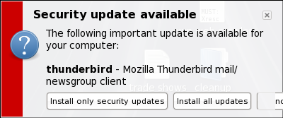 Created attachment 29833 [details] Notification with graphical glitch -- button cut off PackageKit 0.4.9-1 gnome-packagekit 2.27.3-1 Fedora 11 Attaching screen capture ... The notification which appears for updates at the lower right of my screen has a graphical glitch -- there seems to be a third button to the right, but it is partially obscured by a block of white, then cut off by the edge of my screen. This is reproducible always. I don't even know what the button is, as I can't read anything but what appears to be "no" ... I finally worked up the courage to click it a moment ago, but it just seemed to dismiss the notification.