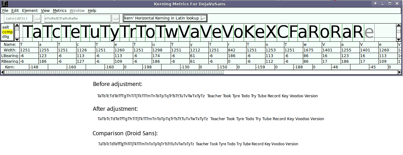 Created attachment 30368 [details] Comparisons for letter spacings before and after adjustment It appears to me that many kerning pairs in DejaVu Sans are a little bit overdone and make the spacing between letters uneven. This is particularly visible for pairs with T/V/R leading. I adjusted a number of pairs with fontforge, and the results seems to be a little better (see the attached screenshot). I am wondering if anyone want to take a look and see if this change is acceptable.