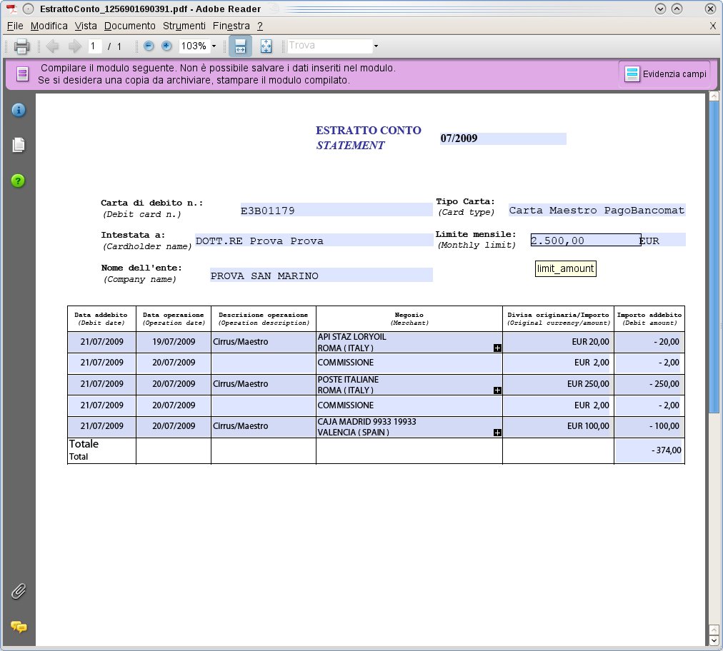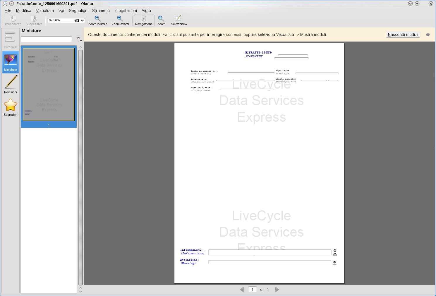 I don't have much experience with pdf forms but I found a kind of ducument bakered by Acrobat that doesn't be rendered correctly in okular that uses poppler as backend. I opened a bug issue in bugs.kde.org (https://bugs.kde.org/show_bug.cgi?id=212394) but they told that this should be a backend (poppler) problem as the same issue is in every opensource pdf rendering engine that I tryied: ghostscript kpdf from kde3 xpdf gimp There are 2 problems: -------------- 1st problem --------------- ghostscript think that the font used by the document contains ArialMT: gs -sDEVICE=x11 EstrattoConto_1256901690391.pdf GPL Ghostscript 8.62 (2008-02-29) Copyright (C) 2008 Artifex Software, Inc. All rights reserved. This software comes with NO WARRANTY: see the file COPYING for details. Processing pages 1 through 1. Page 1 Can't find (or can't open) font file /usr/share/ghostscript/8.62/Resource/Font/ArialMT. Can't find (or can't open) font file ArialMT. Can't find (or can't open) font file /usr/share/ghostscript/8.62/Resource/Font/ArialMT. Can't find (or can't open) font file ArialMT. Scanning /usr/share/fonts/truetype for fonts... 482 files, 480 scanned, 471 new fonts. Loading ArialMT font from /usr/share/fonts/truetype/arial.ttf... 6354392 2943989 20226572 18829752 3 done. >>showpage, press <return> to continue<< while acrobat reader 8 properties says more characters but not ArialMT (I'll include Acrobat properties screenshot) - immagine1.jpeg The same for okular (see attached immagine2.jpeg) --------------2nd problem (MORE IMPORTANT) --------------------- The document contain a form that is compiled to create the pdf from java Adobe LiveCycle Designer 8. Okular shows that there are forms but doesn't show anithing but the page template.... (see immagine3.jpeg) while acrobat shows correctly the form with prefilled fields. The document is a "statement of account" for credit cards so it's a kind of document that is important to be readable....