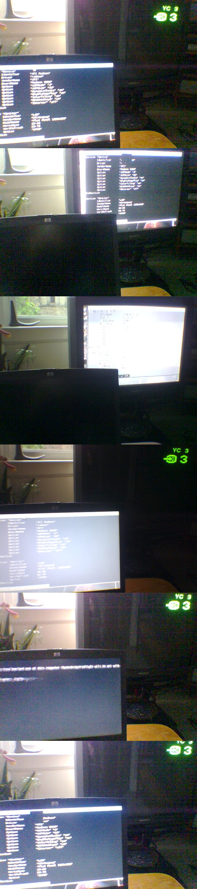 Created attachment 5709 [details] Camera screenshot sequence (350Kb) I have the same problem on a laptop with Radeon Mobility 9000 (rv250) using the ati-1-0-branch dated 2006-04-21 for Xorg 7.0. Attached is a sequence of screenshots from a (low quality) camera phone just for visual representation. 1) Normal display with hardware cursor prior to switching. 2) Switched via BIOS hotkey to s-video on television. Cursor now replaced with black rectangular block. 3) Moved mouse and the gamma effect occurs but the cursor now normal. 4) Swtiched via BIOS hotkey back to LCD on laptop but display remains the same. 5) Switched to console with Alt-Ctrl-F1. The screen is corrupted and jittery where text is displayed. Switching back to X with Alt-Ctrl-F7 resolves issue on X. However switching back to console from now on results in same corrupted and jittery screen on the console only but X is fine when switched back. I'd guess some register has been reset correctly in X but is being reset wrongly on any future switch to the console. 6) Just to demonstrate that switching back to LCD from s-video without moving mouse the same problem will still occur as in 3 if mouse then moved. Scientific this is not, but perhaps of help.