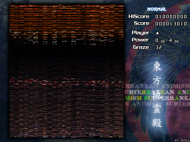 I'm seeing this bug on my machine too and have been for over a year. Intel i945gm Mesa 7.8.1 Xserver 1.8.2 Linux 2.6.35 rc3 Touhou 11 and 12 are pretty much unplayable. 10 fps in fbo mode. 30 fps in-game (60 fps menu) in backbuffer and pbuffer modes. Touhou 10 has it's problem spots during complex scenes, but works fine. All of the older games are fine 90% of the time.