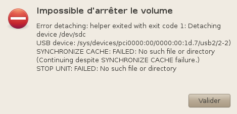 When safely removing a device with the option from the context menu the following error is generated. "Unable to stop device Error detaching: helper exited with exit code 1: sense buffer empty Error SYNCHRONIZE CACHE for /dev/sdc: Success sense buffer empty Error STOP UNIT for /dev/sdc: No such file or directory" A screenshot of the warning dialogue, taken from a downstream duplicate: http://launchpadlibrarian.net/36693130/USB_Flash_Memory_error.png This image says: "Unable to stop USB Flash Memory Error detaching: helper exited with error code 1: synchronize cache(10): Fixed format, current; Sense key: Key=9 Additional sense: Logical unit not ready, cause not reportable Info fld=0x0 [0] Error SYNCHRONIZE CACHE for /dev/sdd: Success start stop unit: transport: Host_status=0x07 [DID_ERROR] Driver_status=0x00 [DRIVER_OK, SUGGEST_OK] Error STOP UNIT for /dev/sdd: No such file or directory" This bug was reported originally by Martin Thoma at Launchpad in Ubuntu at <https://launchpad.net/bugs/466575>.