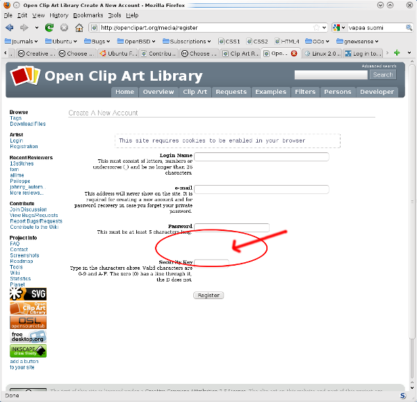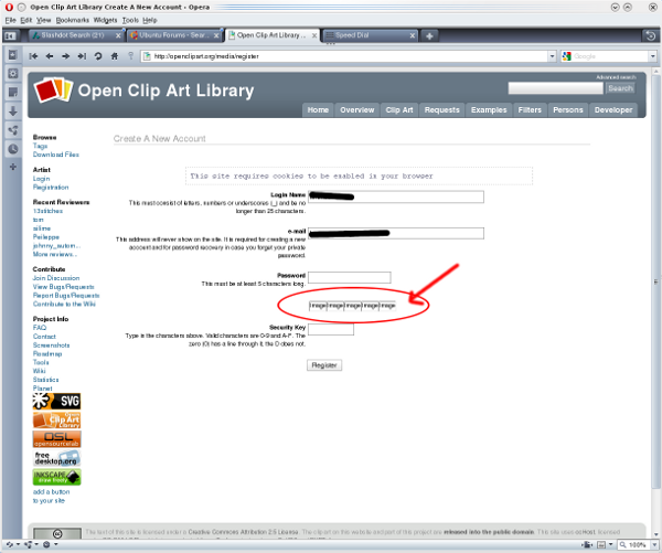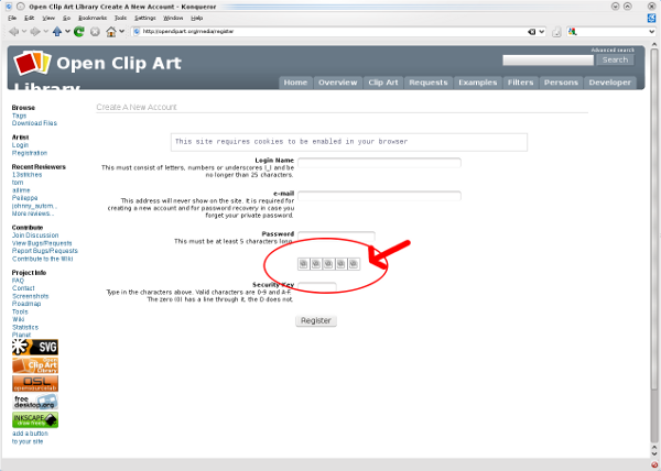 Created attachment 32189 [details] Firefox screen shot of broken registration captcha The registration process requests a "Security Key" to be typed in. There is no image to go along with that field. See the two screen shots. In all the idea of captchas is stupid and should be removed, but at least fix it so that it works with regular browsers.