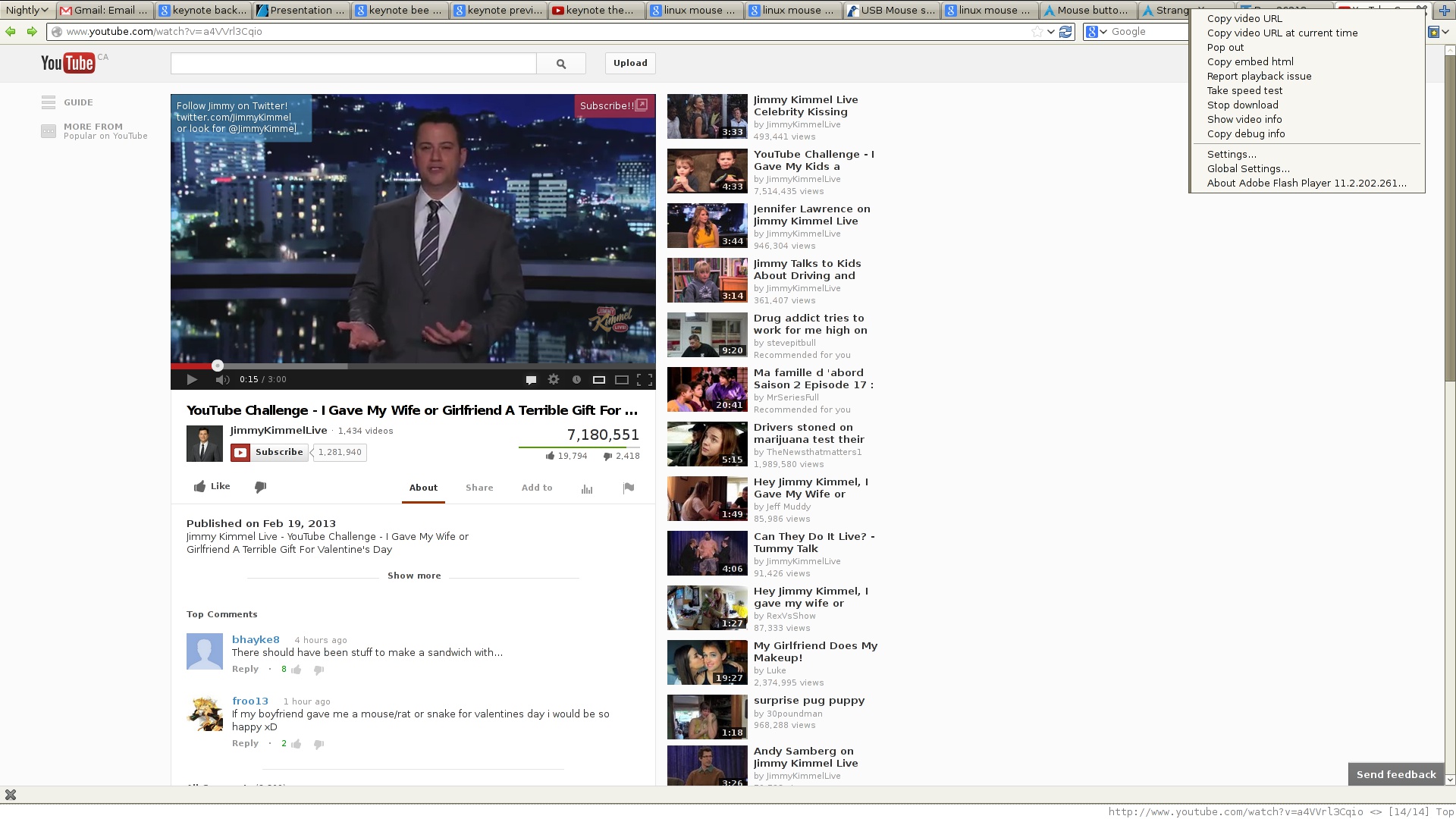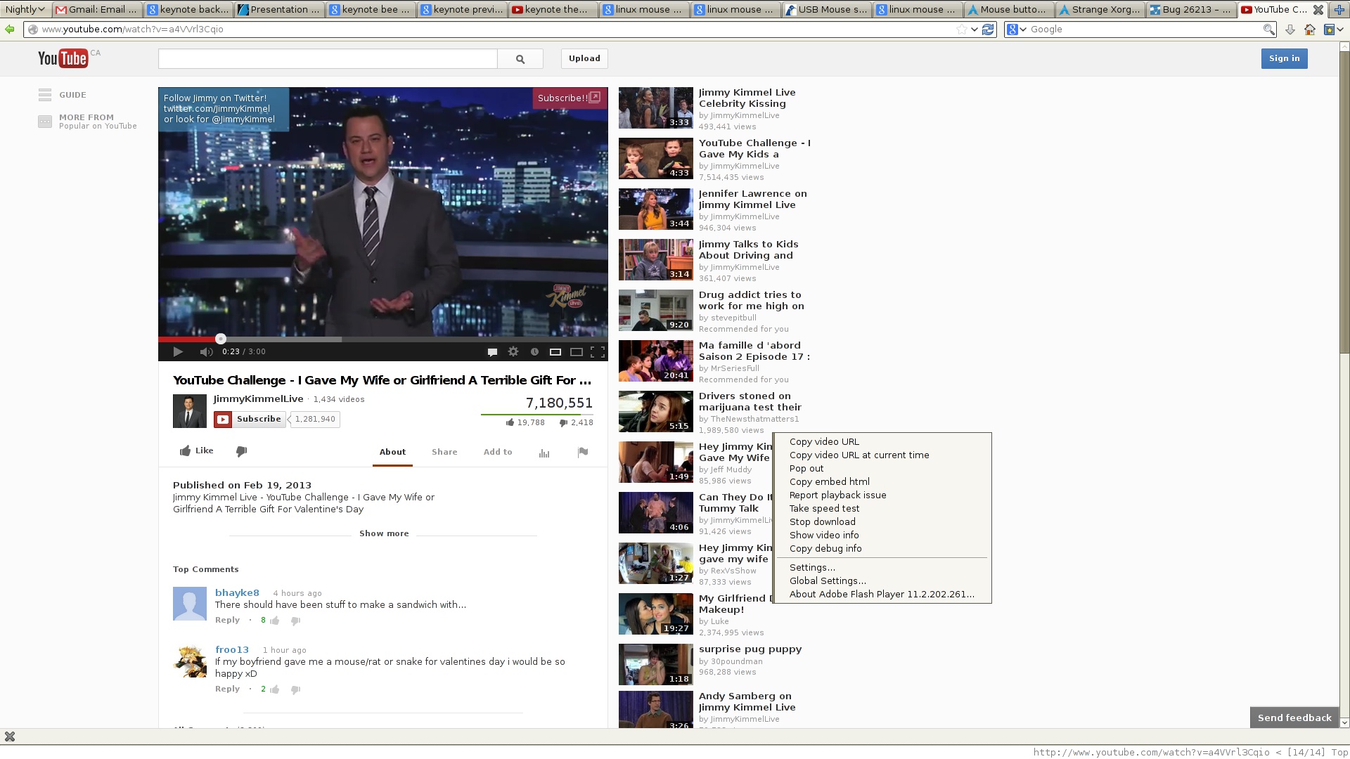 I can reproduce this very easily using the following steps. load a youtube video (which uses flash) right click outside the flash player (context menu shows up) left click outside the flash player (hide context menu) right click inside the flash player (context menu 2 shows up) left click outside the flash player (hide context menu 2) left click inside the flash player (give focus to flash player) left click outside the flash player (context menu 2 shows up) Expected results for the very last step however are that context menu shows up This is not flash related. I have pictures attached showing how clicking on my terminal with the right mouse button brings up a firefox context menu. This is reproducible for me on Debian 7 amd64 with the latest Xorg, and openbox. It is also reproducible on backtrack 5 r3 with kde4, however at this point I'm guessing this is reproducible on nearly everything. I'm using a large lcd as my monitor. I'm not sure if this has anything to do with anything. I will attach three images below. r5@phenom:~$ echo $(< /etc/issue); Xorg -version Debian GNU/Linux 7.0 \n \l X.Org X Server 1.12.4 Release Date: 2012-08-27 X Protocol Version 11, Revision 0 Build Operating System: Linux 3.2.0-4.drm-amd64 x86_64 Debian Current Operating System: Linux phenom 3.2.0-4-amd64 #1 SMP Debian 3.2.35-2 x86_64 Kernel command line: BOOT_IMAGE=/vmlinuz-3.2.0-4-amd64 root=UUID=b5af0983-5a48-4a2c-92d0-878603438b9a ro quiet Build Date: 23 February 2013 02:40:45PM xorg-server 2:1.12.4-5 (Julien Cristau <jcristau@debian.org>) Current version of pixman: 0.26.0 Before reporting problems, check http://wiki.x.org to make sure that you have the latest version. r5@phenom:~$