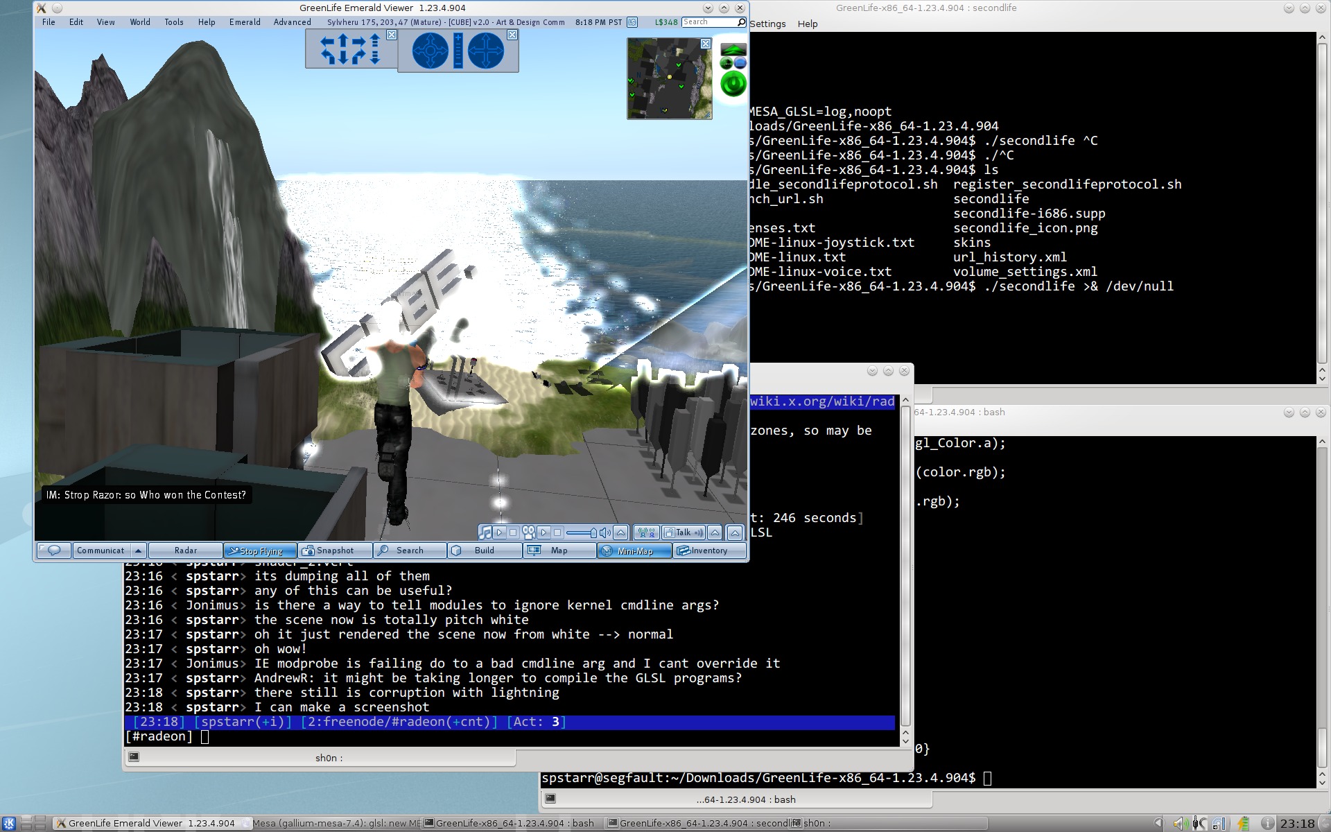 I enabled GLSL in Second Life and noticed some corruption with reflections of lighting (see attached jpg images) When enabling GLSL initially, there is a delay compiling the fragment and shader programs (the game screen goes completely white) then slowly begins to execute the programs.