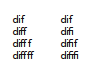 Created attachment 33755 [details] Example I am using Sans 7pt; please note that the issue appears with "medium" or "strong" hinting style; with "slight" or "none" there is no problem. Please see the attached screenshot. On the left side you see what happens when typing the word "diffff" notice that when passing from a single 'f' to the ligature 'ff'(U+FB00) (, the first 'f' is displaced to the left by 1 px. When adding whatever letter afterwards (in this case another 'f'), a 1px space is added; adding the forth 'f' again moves the third 'f' to the right by 1px, but does not fill the gap. On the right side you see what happens when typing the word "dififi" Again when passing from a single 'f' to the 'fi'(U+FB01) glyph, the first 'f' moves 1px to the left (and almost forms a "ligature" with the previous i). This time adding a letter afterwards doesn't add the 1px gap previously noticed. Similar issues appear with the other ligatures fl, ffi and ffl --Thanks