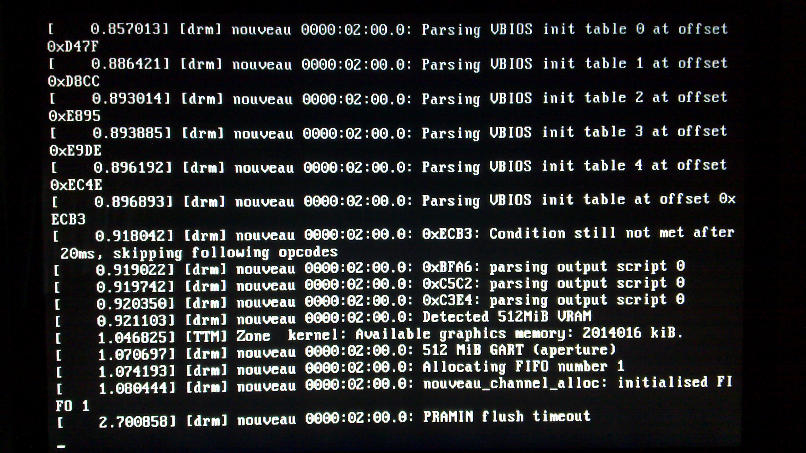 > Mateusz, how did you disable the 9600GT? I am not Mateusz, but I have succeeded in getting nouveau working without any parameters working by deactivating 9600M GT with gpupwr and loading nouveau afterwards. Otherwise my system crashes and the last message which is send to my central syslog-server is: 2012-02-16 10:23:00 kernel [drm] nouveau 0000:02:00.0: PRAMIN flush timeout 2012-02-16 10:23:00 kernel [drm] nouveau 0000:02:00.0: PFIFO_INTR 0x04000000 - Ch 1 2012-02-16 10:23:00 kernel [drm] nouveau 0000:02:00.0: PRAMIN flush timeout 2012-02-16 10:23:00 kernel [drm] nouveau 0000:02:00.0: PFIFO_INTR 0x04000000 - Ch 1 2012-02-16 10:23:00 kernel [drm] Cannot find any crtc or sizes - going 1024x768 2012-02-16 10:23:00 kernel No connectors reported connected with modes 2012-02-16 10:23:00 kernel [drm] No driver support for vblank timestamp query. 2012-02-16 10:23:00 kernel [drm] Supports vblank timestamp caching Rev 1 (10.10.2010). 2012-02-16 10:23:00 kernel [drm] nouveau 0000:02:00.0: PRAMIN flush timeout 2012-02-16 10:23:00 kernel [drm] nouveau 0000:02:00.0: 512 MiB GART (aperture) 2012-02-16 10:23:00 kernel [drm] nouveau 0000:02:00.0: Detected 256MiB VRAM 2012-02-16 10:23:00 kernel [TTM] Initializing pool allocator.