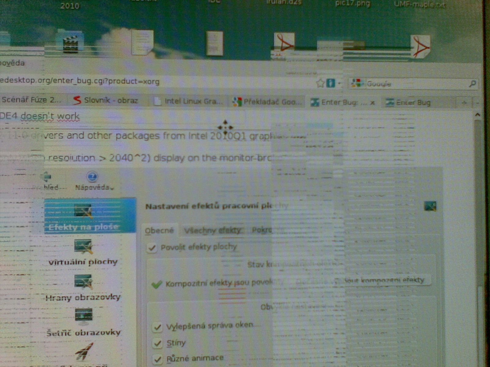 Created attachment 34932 [details] Photo with XRender in KDE4 I use Intel 945GM with xf86-video-intel 2.11.0 drivers and other packages from Intel 2010Q1 graphics package. When I expand screen on 2 monitors (only when resolution > 2040^2) display on the monitor broke down. How the problem looks is in attachment. Sorry for the photo but snapshot wasn't able to take correct picture of the screen. With drivers 2.10.0 it worked but it was really slow. There are no errors in Xorg.0.log. Steps to reproduce with 945GM: 1) use KDE4 2) connect second monitor 3) expand screen xrandr --output VGA1 --verbose --right-of LVDS1 --auto 4) enable XRender in KDE systemsettings