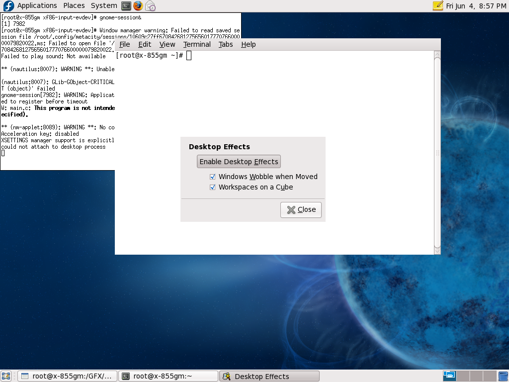 System Environment: -------------------------- Arch: i386 Platform: 855gm Libdrm: (master)04fd3872ee8bd8d5e2c27740508c67c2d51dbc11 Mesa: (7.8)ee6fbf8d2f4718452c36366a08aa798cdda45ace Xserver: (master)bbae92795c7eab062e6722c42fa7915e0cee5d69 Xf86_video_intel: (master)8ece6cf5afa1bb0d8d9328696422f42f3c3adbd6 Kernel: (2.6.33)60b341b778cc2929df16c0a504c91621b3c6a4ad Bug detailed description: ------------------------- This issue is the same as bug #26162 and bug #27258 described. With bug #26162 and bug #27258 fixed, it still happens on 855gm. Reproduce steps: ---------------- 1.xinit& 2.gnome-session&