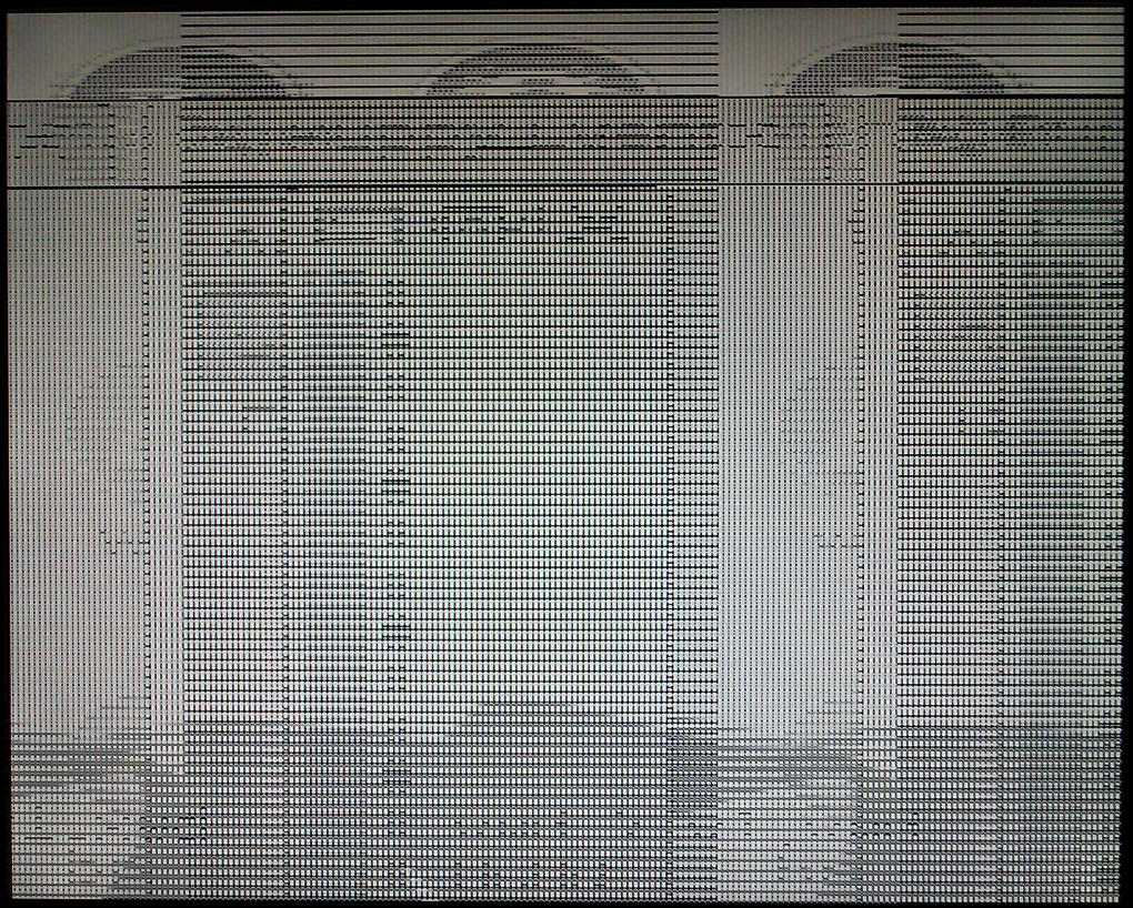 The display is corrupt at the start. After Puppy leaves the text console during boot, the screen goes black for a minute, then straight to the vertical stripes.