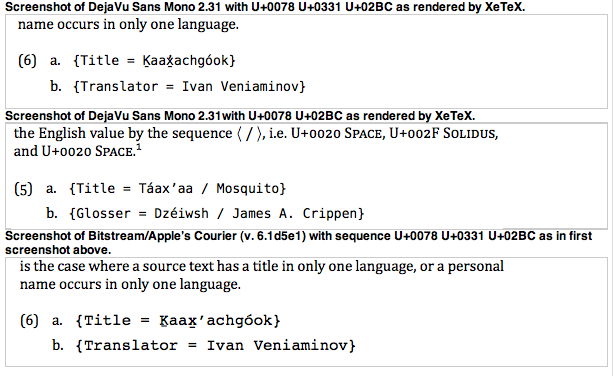 Created attachment 36188 [details] Image of collected screenshots showing misbehavior of U+0331 with XeTeX. Using XeTeX, which should be properly supporting mark positioning, the character U+0331 Combining Macron Below is not rendered correctly. The attached screenshot shows the sequence U+0078 Latin Small Letter X, U+0331 Combining Macron Below, and U+02BC Modifier Letter Apostrophe as produced by XeTeX (version 3.1415926-2.2-0.9995.2 (TeX Live 2009)). The U+02BC Modifier Letter Apostrophe behaves correctly in the other screenshot which shows only the sequence U+0078 U+0331 without the U+0331 Combining Macron Below. Other fonts which support U+0331 display the problematic sequence correctly, as shown by the third screenshot which uses Bitstream/Apple’s Courier (v. 6.1d5e1), although note the incorrect difference between the height of U+0331 versus the diacritic appearing as part of the precombined U+1E34 Latin Capital Letter K with Line Below.