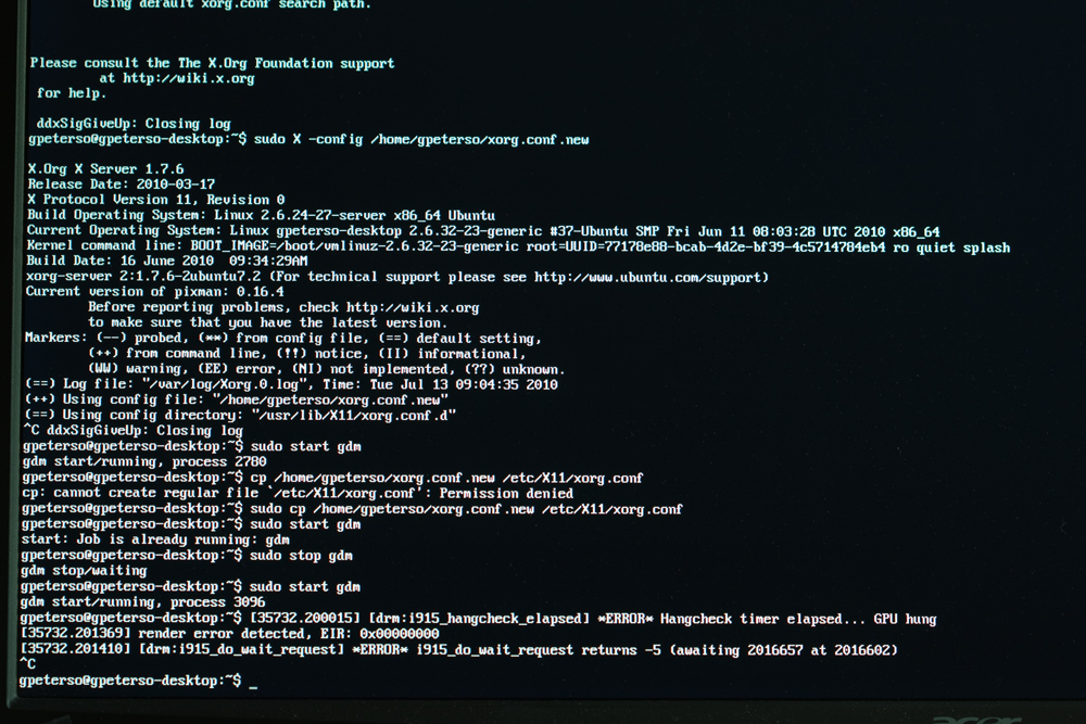 Created attachment 37155 [details] Xorg.0.log.old with ppa:xorg-edgers, kernal 2.6.35-8-generic x86_64 I upgraded to Maverick per Ubuntu instructions, reinstalled xorg-edgers, caused a hang, and uploaded requested files. Better steps to reproduce in about 3 minutes. Note that none of these steps are necessary, they just seem to make it hang quicker. - Use Lucid or Maverick 64-bit Ubuntu with Intel G45 chipset, either default or latest i915 driver. - Set Appearance Preferences: Visual Effects = "None." - Go to Gmail with Firefox and start composing a message with several paragraphs so that it scrolls the little textarea. - Go through the Applications menu opening them all, or as many as your system will handle (I think you need to use up some memory - I have 8GB). - Drag lower-left corner of Firefox window (resizing it) in a small circle (to make it resize vertically and horizontally. - Notice some text corruption before GPU hang. Firefox seems to be the easiest to hang it with when composing a big gmail message. It's not Firefox specific. I've hung it (accidentally) with each of the following: Intellij IDEA 9 OpenOffice Write gnome-terminal emacs Update Manager the Applications Menu Resuming from Hibernate and trying to log in. The only app I've never hung it with or seen text stretching in is the Chromium web browser. The text stretching always precedes a hang. Sorry to be daft and needy before. Let me know if I can do any more to help.