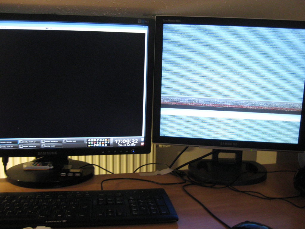 Appendix: If i run 'xrandr --output DVI-1 --off' followed by 'xrandr --output DVI-1 --auto' the second monitor switches off and then on again (garbled screen). Now if i run 'xrandr --output DVI-0 --auto' (happend accidentally first time), monitor one switches to off and the second monitor shows a correct piture again. Huh?! Running 'xrandr --output DVI-0 --auto' afterwards makes monitor one work and monitor two have a garbled picture again. Will now try that cold boot thing.
