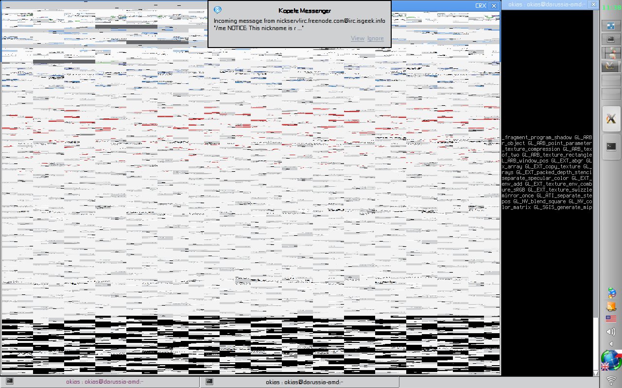 Created attachment 38233 [details] dmesg Errors: ~ $ alienarena --------- [Loading Renderer] --------- Initializing OpenGL display ...setting mode 3: 1024 768 Using XFree86-VidModeExtension Version 2.2 radeon: Successfully grabbed chipset info from kernel! radeon: DRM version: 2.6.0 ID: 0x791f GB: 1 Z: 1 radeon: GART size: 509 MB VRAM size: 128 MB radeon: HyperZ: NO couldn't open libtxc_dxtn.so, software DXTn compression/decompression unavailable Mesa: Mesa 7.9-devel DEBUG build Aug 28 2010 10:23:14 Mesa warning: couldn't open libtxc_dxtn.so, software DXTn compression/decompression unavailable GL_VENDOR: X.Org R300 Project GL_RENDERER: Gallium 0.4 on RS690 GL_VERSION: 2.1 Mesa 7.9-devel GL_EXTENSIONS: GL_ARB_copy_buffer GL_ARB_depth_texture GL_ARB_draw_buffers GL_ARB_draw_elements_base_vertex GL_ARB_fragment_coord_conventions GL_ARB_fragment_program GL_ARB_fragment_program_shadow GL_ARB_fragment_shader GL_ARB_framebuffer_object GL_ARB_half_float_vertex GL_ARB_map_buffer_range GL_ARB_multisample GL_ARB_multitexture GL_ARB_occlusion_query GL_ARB_pixel_buffer_object GL_ARB_point_parameters GL_ARB_point_sprite GL_ARB_provoking_vertex GL_ARB_shader_objects GL_ARB_shading_language_100 GL_ARB_shading_language_120 GL_ARB_shadow GL_ARB_texture_border_clamp GL_ARB_texture_compression GL_ARB_texture_cube_map GL_ARB_texture_env_add GL_ARB_texture_env_combine GL_ARB_texture_env_crossbar GL_ARB_texture_env_dot3 GL_ARB_texture_mirrored_repeat GL_ARB_texture_non_power_of_two GL_ARB_texture_rectangle GL_ARB_texture_swizzle GL_ARB_transpose_matrix GL_ARB_vertex_array_bgra GL_ARB_vertex_array_object GL_ARB_vertex_buffer_object GL_ARB_vertex_program GL_ARB_vertex_shader GL_ARB_window_pos GL_EXT_abgr GL_EXT_bgra GL_EXT_blend_color GL_EXT_blend_equation_separate GL_EXT_blend_func_separate GL_EXT_blend_logic_op GL_EXT_blend_minmax GL_EXT_blend_subtract GL_EXT_compiled_vertex_array GL_EXT_copy_texture GL_EXT_draw_range_elements GL_EXT_framebuffer_blit GL_EXT_framebuffer_multisample GL_EXT_framebuffer_object GL_EXT_fog_coord GL_EXT_gpu_program_parameters GL_EXT_multi_draw_arrays GL_EXT_packed_depth_stencil GL_EXT_packed_pixels GL_EXT_pixel_buffer_object GL_EXT_point_parameters GL_EXT_polygon_offset GL_EXT_provoking_vertex GL_EXT_rescale_normal GL_EXT_secondary_color GL_EXT_separate_specular_color GL_EXT_shadow_funcs GL_EXT_stencil_two_side GL_EXT_stencil_wrap GL_EXT_subtexture GL_EXT_texture GL_EXT_texture3D GL_EXT_texture_cube_map GL_EXT_texture_edge_clamp GL_EXT_texture_env_add GL_EXT_texture_env_combine GL_EXT_texture_env_dot3 GL_EXT_texture_filter_anisotropic GL_EXT_texture_lod_bias GL_EXT_texture_mirror_clamp GL_EXT_texture_object GL_EXT_texture_rectangle GL_EXT_texture_sRGB GL_EXT_texture_swizzle GL_EXT_vertex_array GL_EXT_vertex_array_bgra GL_APPLE_packed_pixels GL_APPLE_vertex_array_object GL_ATI_blend_equation_separate GL_ATI_texture_env_combine3 GL_ATI_texture_mirror_once GL_ATI_separate_stencil GL_IBM_multimode_draw_arrays GL_IBM_rasterpos_clip GL_IBM_texture_mirrored_repeat GL_INGR_blend_func_separate GL_MESA_pack_invert GL_MESA_ycbcr_texture GL_MESA_window_pos GL_NV_blend_square GL_NV_conditional_render GL_NV_light_max_exponent GL_NV_packed_depth_stencil GL_NV_texgen_reflection GL_NV_texture_env_combine4 GL_NV_texture_rectangle GL_OES_read_format GL_SGI_color_matrix GL_SGIS_generate_mipmap GL_SGIS_texture_border_clamp GL_SGIS_texture_edge_clamp GL_SGIS_texture_lod GL_SUN_multi_draw_arrays GL_OES_EGL_image ...allowing CDS ...enabling GL_EXT_compiled_vertex_array ...ignoring GL_EXT_point_parameters ...3DFX_set_global_palette not found ...GL_EXT_shared_texture_palette not found ...using GL_ARB_multitexture ...GL_SGIS_multitexture not found ...using GL_ARB_texture_env_combine ...using GL_EXT_texture_filter_anisotropic ...using GL_EXT_stencil_wrap ...using GL_EXT_framebuffer_blit ...using GL_EXT_stencil_two_side ...using GL_ARB_vertex_buffer_object ...Initializing VBO cache ...Linking Error Mesa: User error: GL_INVALID_OPERATION in glGetUniformfv(program) ...Linking Error ...Linking Error qglBlitFramebufferEXT not found... glGetError() = 0x502 ------------------------------------ ...Initializing IRC client ...IRC rejected due to unset player name ======== CRX Initialized ======== Mesa: User error: GL_INVALID_OPERATION in glDrawBuffer(buffer=0x405) According dmesg.
