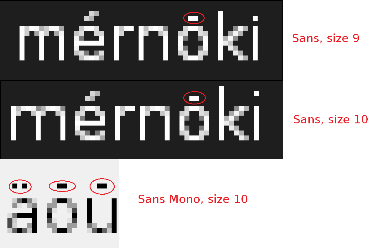 These marks appear as a two adjacent pixels with dejavu sans at sizes 9-10, which looks weird and often confusing. It makes them look like one dot or a short horizontal line. They should be separate. This also happens with sans mono, but only at size 10 and the "รค" appears fine with separate dots (though one sided). The best would be if the two dots would appear two pixels apart in these occasions, because one pixel distance would put them closer to one side and therefore asymmetric which doesn't look nice. I attached an image showing the problem. Tested versions: 2.31, 2.32. Only tested on windows, so I don't know if its like this on other platforms too.