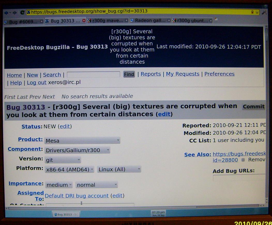 I'm having some textures flashing (very quick showing and disappearing) in when I enable GLSL shading. The problem I see when I enable blur effect in KDE 4.5.1 (some windows and panels are showing and disappearing) and in Nexuiz when I enable to use GLSL option in game settings menu. When textures are disappearing I can see through walls in Nexuiz or see my desktop wallpaper when I should see application window. It can be seen in game menu, too where 'Settings', 'About' and 'Quit' menus are flashing. It's flashing very quickly and cannot be seen on Nexuiz screenshots (I've done almost 100 of them to check). kernel: linux-image-2.6.35-22-generic (2.6.35-22.33) xorg: 7.5+6ubuntu3 xserver-xorg-core: 2:1.9.0-0ubuntu7 mesa: 7.10.0~git20100925+gallium+r300.58c24390-0ubuntu0tormod graphic card: Sapphire Radeon 9600 256MB AGP (RV350) OpenGL vendor string: X.Org R300 Project OpenGL renderer string: Gallium 0.4 on RV350 OpenGL version string: 2.1 Mesa 7.10-devel OpenGL shading language version string: 1.20 01:00.0 VGA compatible controller [0300]: ATI Technologies Inc RV350 AP [Radeon 9600] [1002:4150] 01:00.1 Display controller [0380]: ATI Technologies Inc RV350 AP [Radeon 9600] (Secondary) [1002:4170]