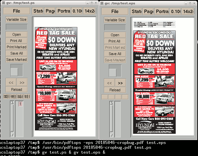 Created attachment 71362 [details] screen capture to show the problem The initial PDF that I attached to this bug is sufficient to reproduce the problem. After running pdftops, you need to view the EPS with a program that is capable of showing all of the image and not only what is inside the area specified in the %%BoundingBox comment. In the screen capture, I used the unpatched pdftops 0.18.4 distributed with Fedora 17. I made both a PS and an EPS and then viewed them with "gv". gimp might not be a good test, because as far as I know, it does not natively support PDF, PS or EPS, and so it must rasterize them, and it probably rasterizes them to the size in the %%BoundingBox comment, which means that you will never see anything outside the crop box. gv allows you to override the %%BoundingBox comment. I selected a large size that I used for previewing broadsheet newspaper pages. pdftops crops PS. If you try this with my test PDF and then compare the PS and EPS files, the PS has the additional code 0.5 55 translate 7 16 417 1010 re W immediately before the %%EndPageSetup comment. My guess is that someone thought that it was not necessary to crop the EPS because application embedding the EPS on a page would always crop it to the size in the %%BoundingBox. William