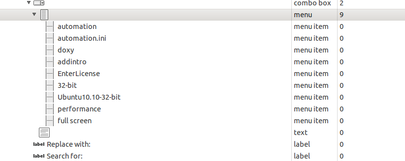 What versions of gedit and gtk+ are you using that show the text child in AT-SPI1? I am not seeing a text child in natty with either AT-SPI1 or AT-SPI2, and the script at http://pastebin.com/8uz5W5fB fails to find the child with both AT-SPI1, and AT-SPI2. Looking at the sources of gedit 2.30.4 and gtk+ 2.24.1 (the versions I have on natty), I can't see how the text child could ever be exposed correctly. gailcombobox.c, used for a GtkComboBox, exposes 1 or 2 children: a MENU child and an additional TEXT child if the has-entry property is set. The combo boxes in the gedit find dialog are GeditHistoryEntry dialogues. GeditHistoryEntry as of v2.30.4 was based on GtkComboBoxEntry. GtkComboBoxEntry was based on GtkComboBox but did not set has_entry. Rather, it created its own entry child. GAIL does not appear to have a separate class for GtkComboBoxEntry, so it will use the logic for GtkComboBox, overriding the normal logic for determining the number of children and thus ignoring the entry that GtkComboBoxEntry adds. Note that GtkComboBoxEntry was deprecated in GTK+ 2.24 and is removed in GTK+ 3, so later versions of gedit do not use it. So, if you are seeing a text child with these versions of gedit and gtk+, then I am confused...