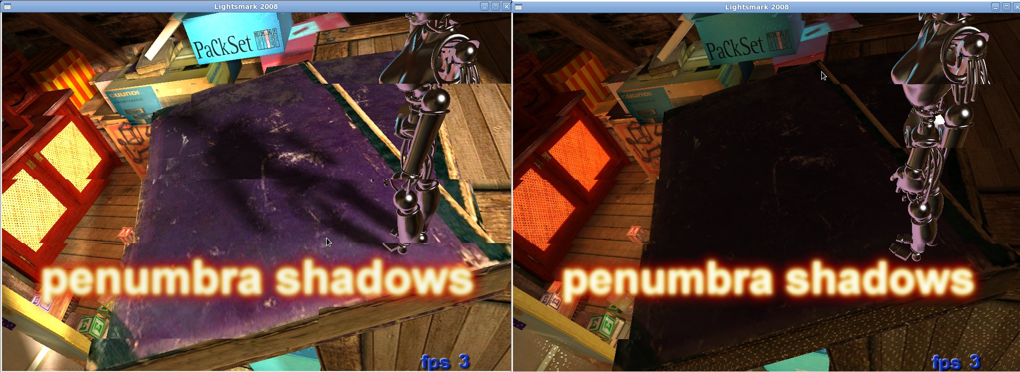 What penumbra quality number are you using in Lightsmark? Are you seeing any error messages like this: r300: ERROR: FS input generic 18 unassigned, not enough hardware slots. r300: ERROR: FS input generic 19 unassigned, not enough hardware slots. r300: ERROR: FS input generic 20 unassigned, not enough hardware slots. r300: ERROR: FS input WPOS unassigned, not enough hardware slots. If you are, were they also present before commit 8833f53e659e079e7ab74bb9197f9b44b1eeefe0?