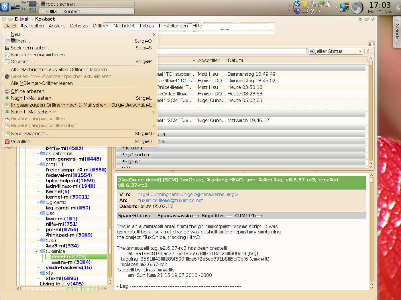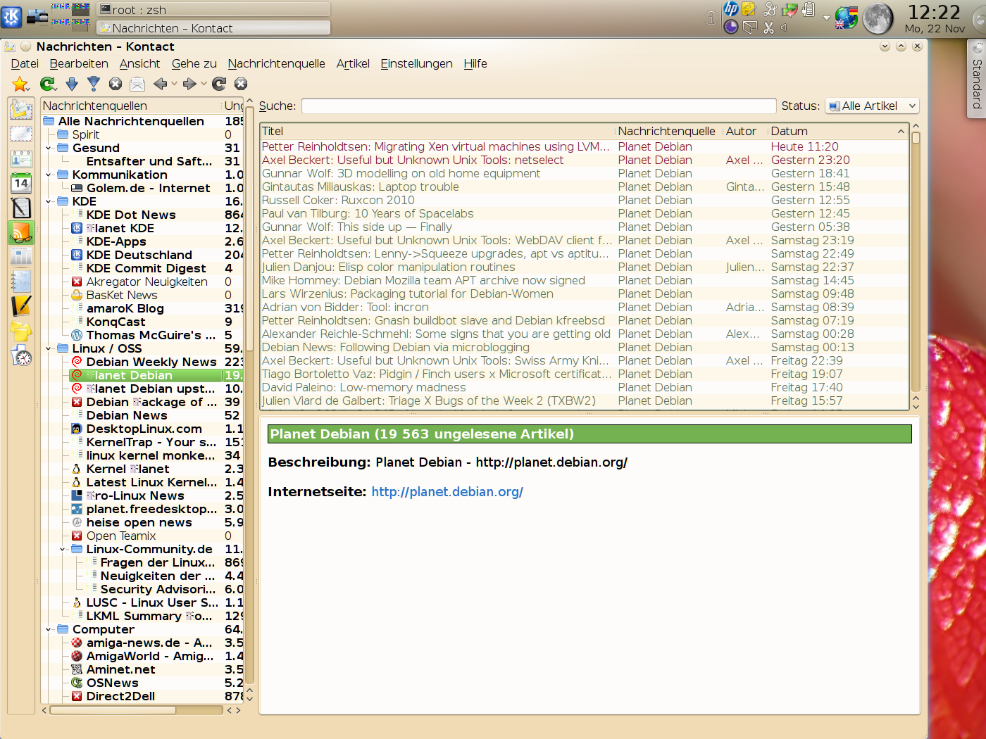 Ok, these corruption does not seem to appear when I disabled compositing by pressing Alt-Shift-F12 on display :0 and shortly after I start the second KDE session on display :1 as well. So this seems to be related to having to instances of Radeon KMS X.org displays running at the same time. Since I already tried with :1 without compositing, it might be sufficient, when :0 runs without compositing. I try with :0 without and :1 with compositing after I am confident that both without compositing run stable. Bug 23622 - probably radeon kms / memory shortage related scheduling while atomic https://bugzilla.kernel.org/show_bug.cgi?id=23622 might be related to this one. I will also compile a 2.6.37-rc3 and test it as well.