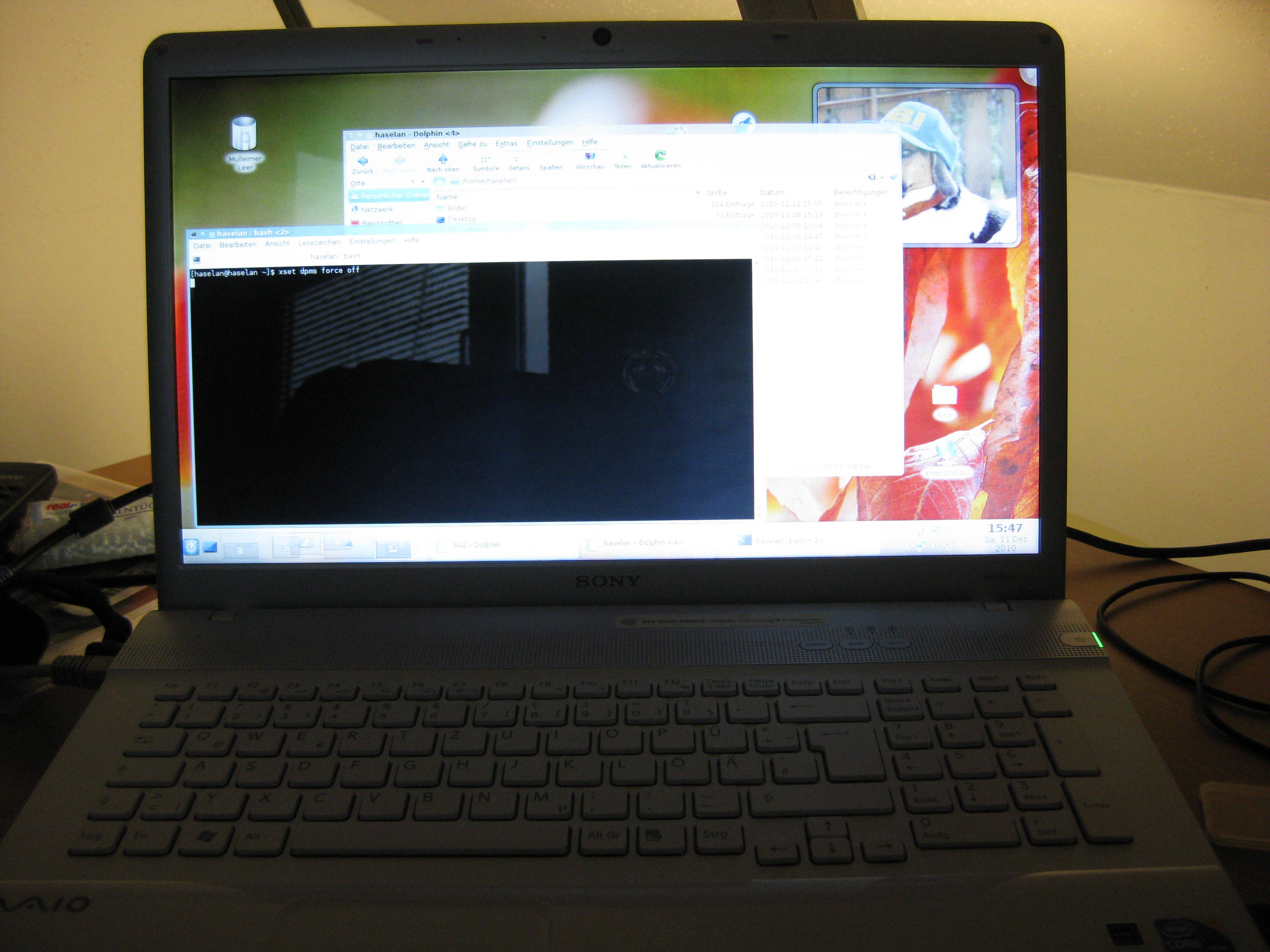 Created attachment 41011 [details] Fade-to-white-picture No.1 On my new Sony Vaio laptop (VPCEC3L1E) the screen fades to white (with backlights on, i think) instead of simply blanking out. This can be reproduced by running "xset dpms force off" or by simply waiting until powermanagement kicks in. The graphics card used is a radeon 5xxx(?) (01:00.0 VGA compatible controller: ATI Technologies Inc Device 68e0). This happens on console and in X. I'll attach some pictures showing the issue. Thanks for any help! PS: I hope i did choose the correct product/component for this type of bug.