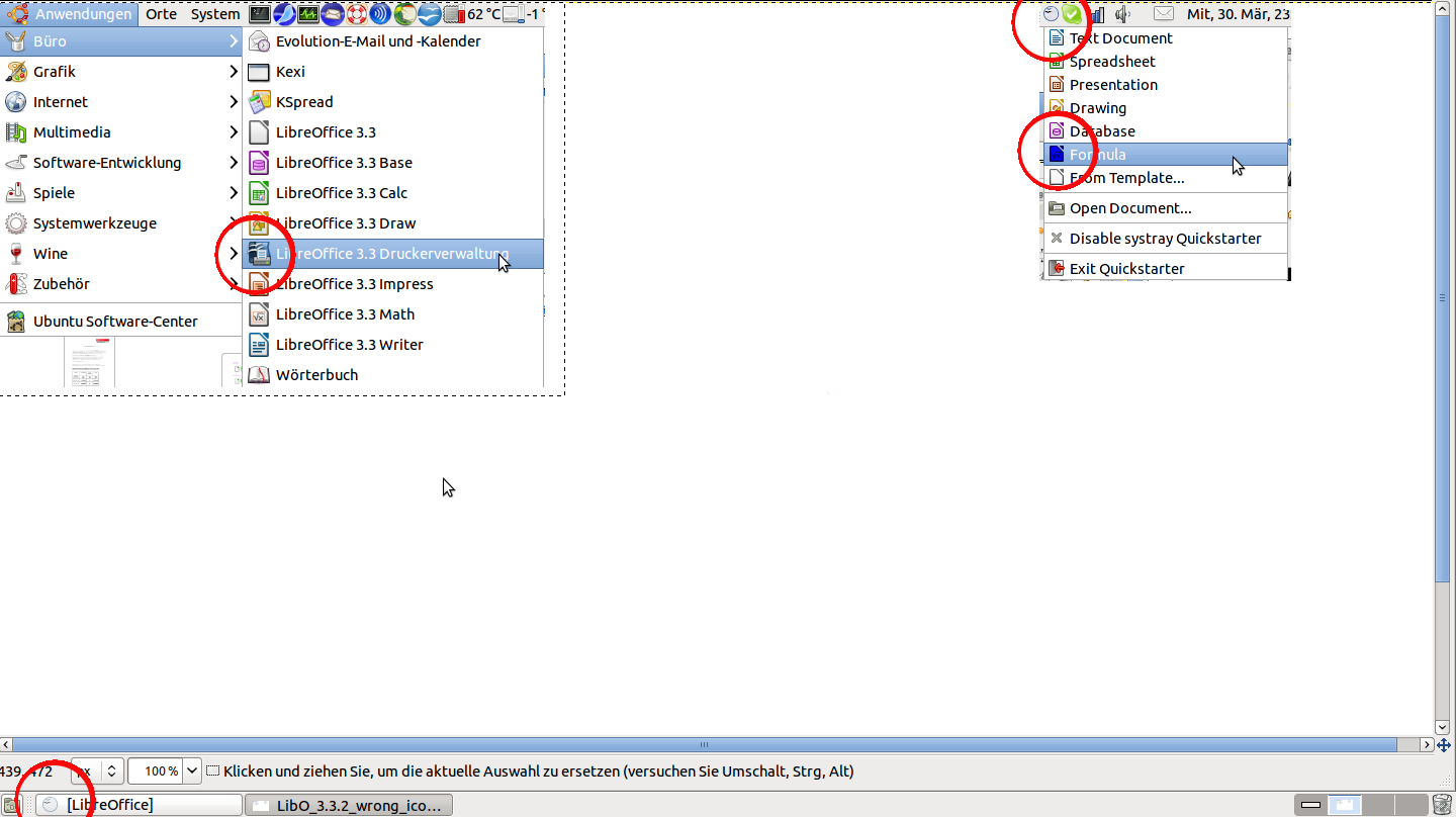 @Thorsten: Sorry, I can't test the appearances from comment 32 anymore: - on Ubuntu 11.04 there is no hierarchical menu containing the different LibreOffice icons including the printer option. - I can't activate Quickstarter in RC2 (even with unstable features activated there is no selection in Tools - Options - General - Memory. For Tools - Options icons: It's not only the main icon in all the themes, but all the sub-application icons in Galaxy. Today and tomorrow I don't have the time to dig deeper in this topic, but I'll try to during the next days...