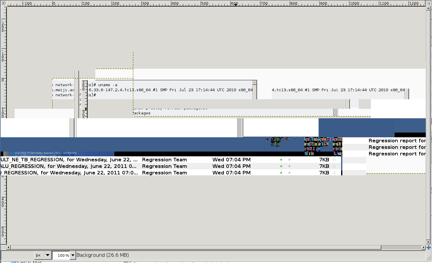 Created attachment 48353 [details] screenshot of graphics buffer problem with gimp Attached is a screenshot of a Gimp (2.6.11) window. The actual image is the previous attachment, but the display shows random blocks of garbage outside the "view" of the image. (You can see some of the dashed line around where the "image" is inside the gimp window.) The garbage blocks show up (and sometimes disappear and sometimes disappear) when scrolling and zooming.