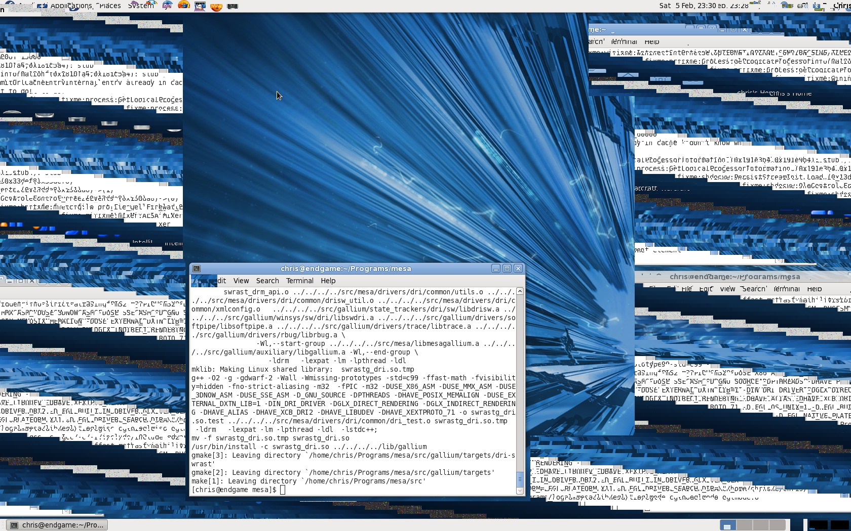 Created attachment 42979 [details] The screenshot doesn't actually match the screen, but it gives you the idea. The screen corruption "just happened" suddenly, and I was forced to SIGHUP the X server from a console to make it disappear again. The corruption was actually across the entire screen - the "normal-looking" region in the middle seems to be just an artifact of the screen-capture process. I am using xf86-video-ati from git, with Fedora 14 and a vanilla 2.6.36.3 kernel. The graphics card is a HD4890.