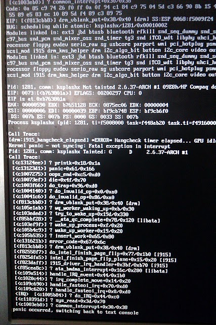 Created attachment 43294 [details] Kernel Output I keep getting a kernel panic when using KDE 4.6 and compositing with OpenGL. I have attached an image of the kernel panic output. I am using Arch Linux with the latest libgl and intel-dri packages, and I am using xf86-video-intel as my video driver. This is my chipset: "VGA compatible controller: Intel Corporation 82915G/GV/910GL Integrated Graphics Controller (rev 04)"
