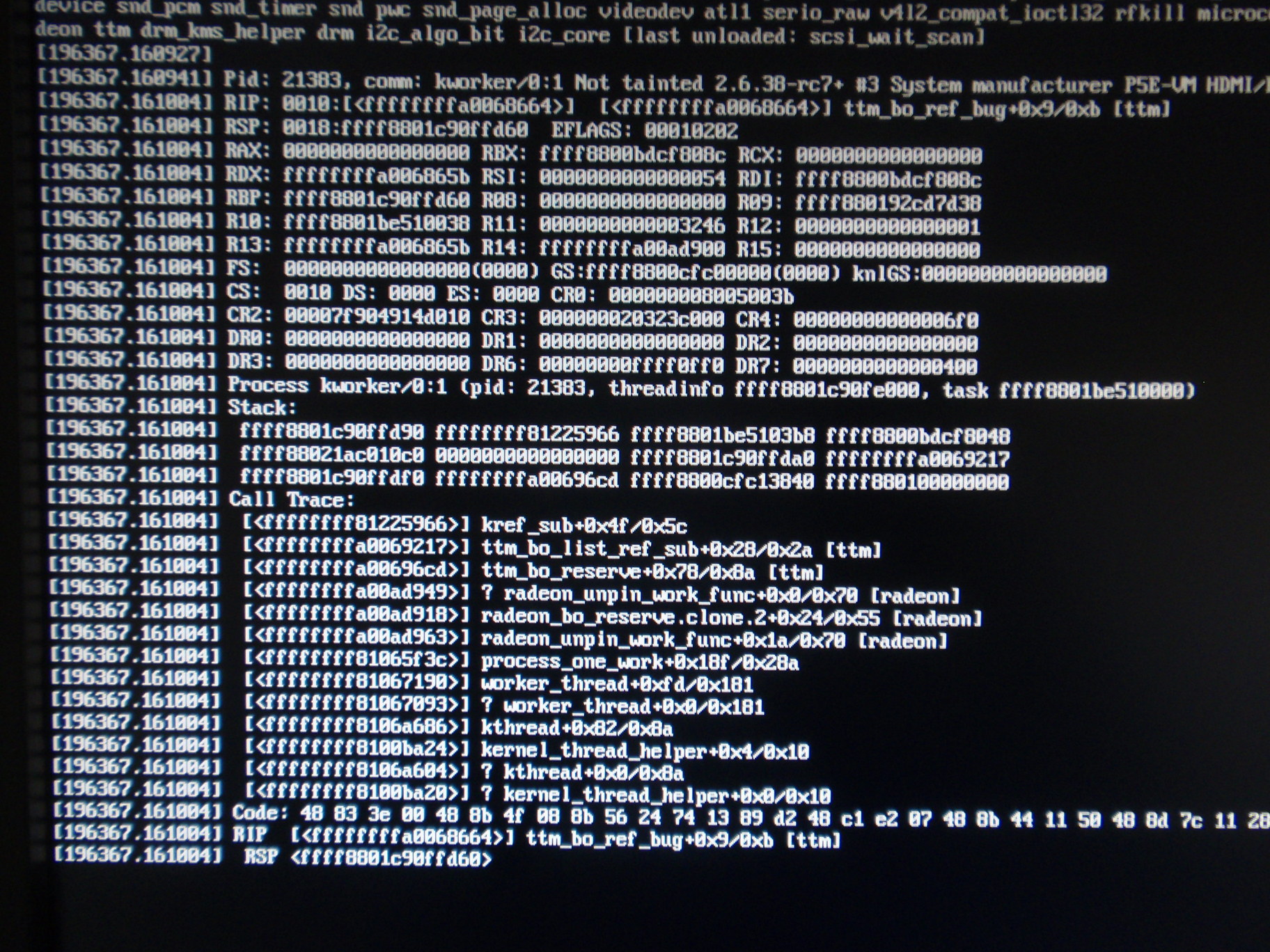 Hi, I've got a repeatable oops that happens when viewing full screen video in flash in chromium, under kwin (with effects enabled) and switching virtual desktop/workspace on ATI Technologies Inc RV710 [Radeon HD 4350]. Hardware: ATI Technologies Inc RV710 [Radeon HD 4350] in an ASRock P55M Pro motherboard, with an i7-860 CPU, and 8GB RAM, connected to Dell S2409W display via DVI. OS: Ubuntu Natty upto date as of today, 64bit install, running KDE. Kernel: Daily build from DRM next from http://kernel.ubuntu.com/~kernel-ppa/mainline/drm-next/current/ linux-image-2.6.38-996-generic_2.6.38-996.201103041138_amd64.deb claims to be commit e73f88af66fcc50083fae4b7e1c39b469179a97a DRM/mesa/etc: ii libdrm-radeon1 2.4.23-1ubuntu3 ii libdrm2 2.4.23-1ubuntu3 ii libgl1-mesa-dri 7.10.1~git20110215.cc1636b6-0 I've got a 3x3 virtual desktop setup, and am running Chromium and go to youtube and pop a video full screen; and move around the virtual desktop with ctrl-alt-arrows. The oops below was produced twice. I've got a bunch of related symptoms; I installed the daily build because I was getting instances of [drm:radeon_cs_ioctl] *ERROR* Failed to parse relocation -35! (which I think is EDEADLOCK) doing similar combinations of going in and out of full screen flash. I've also seen when I try to go into full screen rapid flickering as if it can't decide whether to go into full screen or stay out; once that's triggered that flickering can repeat itself when starting other apps. This corresponds to Ubuntu bug https://bugs.launchpad.net/ubuntu/+source/linux/+bug/717870 and possibly also ubuntu bug 717889 Mar 5 22:12:17 major kernel: [ 495.890854] ------------[ cut here ]------------ Mar 5 22:12:17 major kernel: [ 495.890882] kernel BUG at /home/kernel-ppa/COD/linux/drivers/gpu/drm/ttm/ttm_bo.c:272! Mar 5 22:12:17 major kernel: [ 495.890917] invalid opcode: 0000 [#1] SMP Mar 5 22:12:17 major kernel: [ 495.890939] last sysfs file: /sys/devices/system/cpu/cpu7/topology/thread_siblings Mar 5 22:12:17 major kernel: [ 495.890971] CPU 1 Mar 5 22:12:17 major kernel: [ 495.890981] Modules linked in: ip6table_filter ip6_tables ebtable_nat ebtables ipt_MASQUERADE iptable_nat nf_nat nf_conntrack_ipv4 nf_defrag_ipv4 xt_state nf_conntrack ipt_REJECT binfmt_misc xt_CHECKSUM iptable_mangle xt_tcpudp iptable_filter ip_tables x_tables bridge stp kvm_intel kvm dm_crypt snd_hda_codec_hdmi snd_hda_codec_via snd_hda_intel snd_seq_midi snd_hda_codec snd_rawmidi snd_hwdep snd_seq_midi_event snd_seq snd_pcm snd_seq_device snd_timer snd ppdev soundcore parport_pc snd_page_alloc lp parport radeon usbhid usb_storage ttm hid firewire_ohci drm_kms_helper uas drm firewire_core r8169 pata_via crc_itu_t i2c_algo_bit configfs Mar 5 22:12:17 major kernel: [ 495.891289] Mar 5 22:12:17 major kernel: [ 495.893682] Pid: 42, comm: kworker/1:1 Not tainted 2.6.38-996-generic #201103041138 P55M Pro/To Be Filled By O.E.M. Mar 5 22:12:17 major kernel: [ 495.896183] RIP: 0010:[<ffffffffa00f3d89>] [<ffffffffa00f3d89>] ttm_bo_ref_bug+0x9/0x10 [ttm] Mar 5 22:12:17 major kernel: [ 495.898561] RSP: 0000:ffff8802277ebd90 EFLAGS: 00010202 Mar 5 22:12:17 major kernel: [ 495.900903] RAX: ffffffffa00f6801 RBX: 0000000000000000 RCX: ffff880222bb3120 Mar 5 22:12:17 major kernel: [ 495.903223] RDX: 0000000000000000 RSI: 0000000000000000 RDI: ffff880222bb308c Mar 5 22:12:17 major kernel: [ 495.905545] RBP: ffff8802277ebd90 R08: 0000000000000000 R09: 0000000000000000 Mar 5 22:12:17 major kernel: [ 495.907870] R10: ffff8800c7453b58 R11: 0000000000000000 R12: ffff880222bb308c Mar 5 22:12:17 major kernel: [ 495.910371] R13: ffffffffa00f3d80 R14: ffff880222bb3048 R15: 0000000000000000 Mar 5 22:12:17 major kernel: [ 495.912659] FS: 0000000000000000(0000) GS:ffff8800c7440000(0000) knlGS:0000000000000000 Mar 5 22:12:17 major kernel: [ 495.914975] CS: 0010 DS: 0000 ES: 0000 CR0: 000000008005003b Mar 5 22:12:17 major kernel: [ 495.917310] CR2: 00000000f0969000 CR3: 00000001dc19a000 CR4: 00000000000006e0 Mar 5 22:12:17 major kernel: [ 495.919642] DR0: 0000000000000000 DR1: 0000000000000000 DR2: 0000000000000000 Mar 5 22:12:17 major kernel: [ 495.921973] DR3: 0000000000000000 DR6: 00000000ffff0ff0 DR7: 0000000000000400 Mar 5 22:12:17 major kernel: [ 495.924274] Process kworker/1:1 (pid: 42, threadinfo ffff8802277ea000, task ffff8802277bc440) Mar 5 22:12:17 major kernel: [ 495.926774] Stack: Mar 5 22:12:17 major kernel: [ 495.929067] ffff8802277ebdc0 ffffffff812d31be 0000000000000001 0000000000000000 Mar 5 22:12:17 major kernel: [ 495.931384] ffff880222b1a208 0000000000000000 ffff8802277ebdd0 ffffffffa00f5048 Mar 5 22:12:17 major kernel: [ 495.933688] ffff8802277ebe10 ffffffffa00f67c8 01ff8802277ebe10 ffff880222bb3000 Mar 5 22:12:17 major kernel: [ 495.936003] Call Trace: Mar 5 22:12:17 major kernel: [ 495.938310] [<ffffffff812d31be>] kref_sub+0x3e/0x80 Mar 5 22:12:17 major kernel: [ 495.940583] [<ffffffffa00f5048>] ttm_bo_list_ref_sub+0x28/0x30 [ttm] Mar 5 22:12:17 major kernel: [ 495.942967] [<ffffffffa00f67c8>] ttm_bo_reserve+0x88/0xa0 [ttm] Mar 5 22:12:17 major kernel: [ 495.945209] [<ffffffffa0154858>] radeon_unpin_work_func+0x28/0xb0 [radeon] Mar 5 22:12:17 major kernel: [ 495.947398] [<ffffffff810813ce>] process_one_work+0x10e/0x390 Mar 5 22:12:17 major kernel: [ 495.949673] [<ffffffffa0154830>] ? radeon_unpin_work_func+0x0/0xb0 [radeon] Mar 5 22:12:17 major kernel: [ 495.951872] [<ffffffff8108221d>] worker_thread+0xdd/0x260 Mar 5 22:12:17 major kernel: [ 495.954094] [<ffffffff81082140>] ? worker_thread+0x0/0x260 Mar 5 22:12:17 major kernel: [ 495.956341] [<ffffffff81086277>] kthread+0x97/0xa0 Mar 5 22:12:17 major kernel: [ 495.958735] [<ffffffff8100ce24>] kernel_thread_helper+0x4/0x10 Mar 5 22:12:17 major kernel: [ 495.958738] [<ffffffff810861e0>] ? kthread+0x0/0xa0 Mar 5 22:12:17 major kernel: [ 495.958740] [<ffffffff8100ce20>] ? kernel_thread_helper+0x0/0x10 Mar 5 22:12:17 major kernel: [ 495.958741] Code: 48 89 10 48 89 8f e0 00 00 00 48 89 8f d8 00 00 00 c9 89 f0 c3 66 6