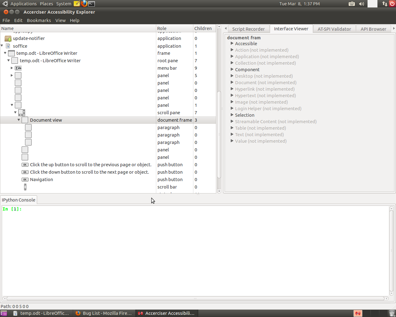 >>Not reproduced with libo Version 4.0.0.0.beta1 (Build ID: >>87906242e87d3ddb2ba9827818f2d1416d80cc7) >>Win7 32Bits. Is there a confusion? It seems you are trying to reproduce on Windows 7 a bug which was reported with Linux. >>I suppose you talk the explorer displayed by F5 ? Are you referring to the navigator feature of Libreoffice which can be toggled on/ off with F5? No, my bug doesn't relate to it. I mean Accerciser Accessibility Explorer (https://live.gnome.org/Accerciser). It is an interactive Python accessibility explorer for the GNOME Linux desktop. It uses AT-SPI to inspect and control widgets, allowing you to check if an application is providing correct information to assistive technologies and automated test frameworks. >>I see my 2 sections below "sections" >>If I dubble clic on section 1, cursor is moved on the start of this section. >>(box before the text of my section) >>I think it's the correct way, isn'it ? Please run LibreOffice on Linux. Start Accerciser (Its a distinct app, not a part of LibreOffice. Now go to the accessible tree view at top left of Accerciser window and see if you can find two accessible objects with role 'section'.