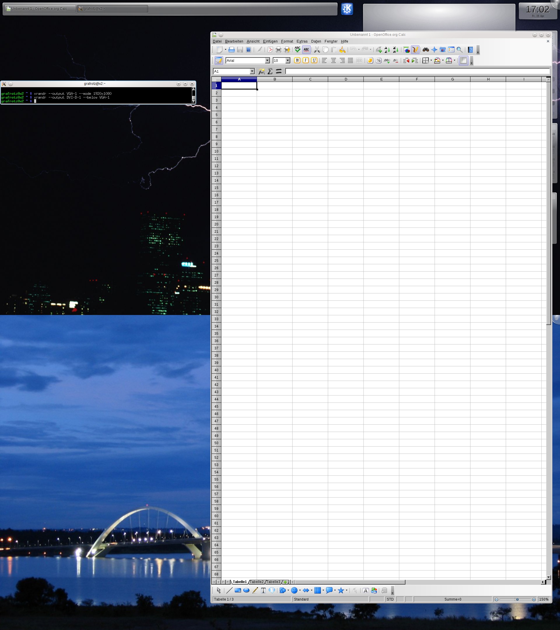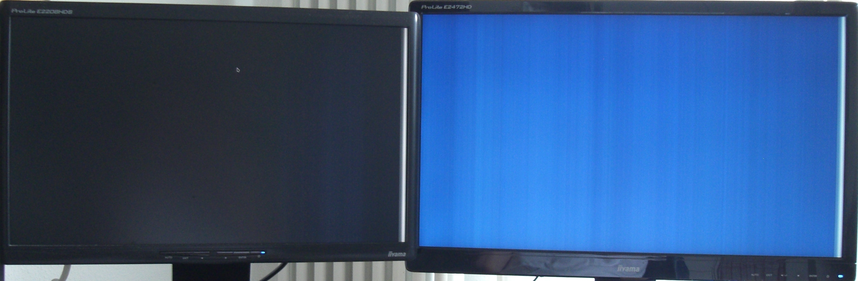 the "old" combination works fine: x11-drivers/xf86-video-nouveau-0.0.16_pre2010101 x11-base/xorg-server-1.9.5 x11-libs/libdrm-2.4.22 media-libs/mesa-7.9 with the following settings: Section "Screen" Identifier "Screen-two" Device "nouveau-two" Monitor "DVI-D-1" Monitor "VGA-1" DefaultDepth 24 Subsection "Display" Depth 24 Virtual 3840 1080 EndSubsection EndSection and the following commands: xrandr --output VGA-1 --mode 1920x1080 xrandr --output DVI-D-1 --mode 1920x1080 xrandr --output DVI-D-1 --primar xrandr --output VGA-1 --left-of DVI-D-1 the new (perhaps not the newest) combination cause problems: x11-drivers/xf86-video-nouveau-0.0.16_pre20101130 x11-base/xorg-server-1.9.5 x11-base/xorg-drivers-1.9 media-libs/mesa-7.10.1 x11-libs/libdrm-2.4.23 I figured out that using both displays one above the other works: xrandr --output DVI-D-1 --below VGA-1. the final resolution is: 1920 * 2160 The only problem is a completly wrong auto-dpi-setting. But my favorite layout (booth displays beside each other does not work): xrandr --output DVI-D-1 --right-of VGA-1 here the final resolution is: 3840 * 1080 "does not work" means: i see a mouse courser which a can move around booth displays, but the picture has errors (vertical stripes) and the desktop is not usable at all (no text, no icons). I used kde4 and xfce4 for testing. When I use 1280*1024 on the left screen, "xrandr --output DVI-D-1 --below VGA-1." works fine. so the final resolution is 3200 * 1080 So why 3840 * 1080 is too much? The maximum should be 4096 * 4096 as xrandr --query tells me: Screen 0: minimum 320 x 200, current 3840 x 1080, maximum 4096 x 4096 VGA-1 connected 1920x1080+0+0 (normal left inverted right x axis y axis) 477mm x 268mm 1920x1080 60.0*+ DVI-D-1 connected 1920x1080+1920+0 (normal left inverted right x axis y axis) 531mm x 299mm 1920x1080 60.0*+ This output was made with the old working combination.