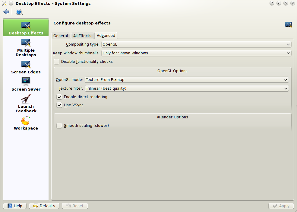 Created attachment 45815 [details] KWin Desktop Effects configuration According to KWin configuration Direct Rendering is being used.