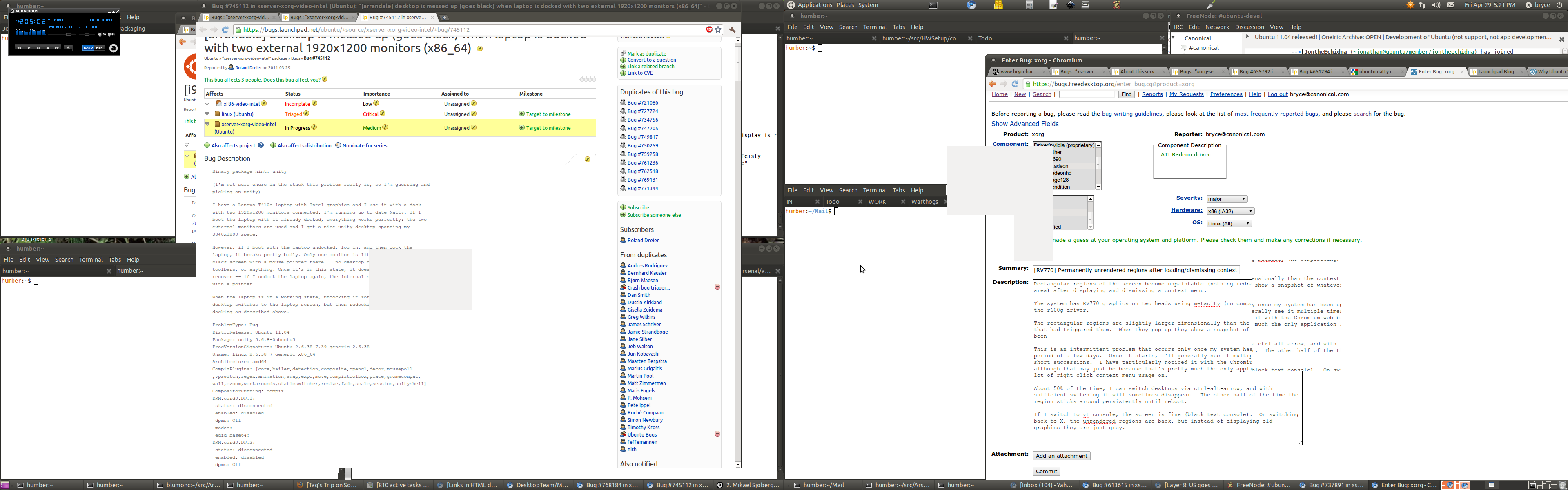 Rectangular regions of the screen become unpaintable (nothing redraws in that area) after displaying and dismissing a context menu. The system has RV770 graphics on two heads using metacity (no compositing) and the r600g driver. The rectangular regions are slightly larger dimensionally than the context menu that had triggered them. When they pop up they show a snapshot of whatever had been displayed - snippets of web pages typically. When I hover the mouse cursor over them, the cursor will change shape back to an arrow. The region also blocks clicks if there is a hyperlink or button behind it. Regular windows will not paint over these areas, however subsequent context menus will display over the top of them (and can be used normally). This is an intermittent problem that occurs only once my system has been up for a period of a few days. Once it starts, I'll generally see it multiple times in short successions. I have particularly noticed it with the Chromium web browser, although that may just be because that's pretty much the only application I do a lot of right click context menu usage on. I did notice an inverse effect when I did a context menu on a gnome-terminal window, it restored a portion of one of the regions (see screenshot). About 50% of the time, I can switch desktops via ctrl-alt-arrow, and with sufficient switching it will sometimes disappear. The other half of the time the region sticks around persistently until reboot. If I switch to vt console, the screen is fine (black text console). On switching back to X, the unrendered regions are back, but instead of displaying old graphics they are just grey.