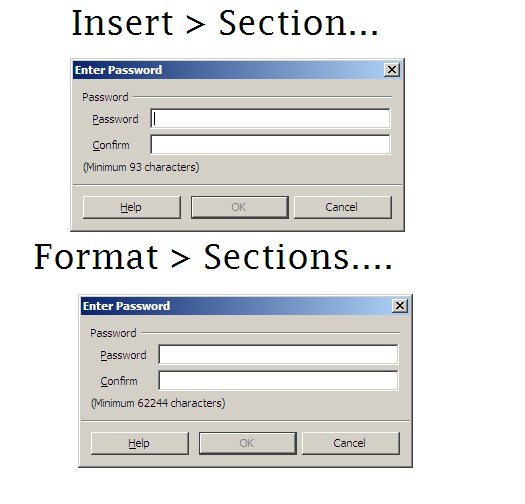 Created attachment 47343 [details] password dialogs Windows XP LibreOffice OOO340m1 (Build:11) Open a new text document; go to Insert > Section...; click Protection; click With password; Writer requires a password with 93 characters. Open a document with an unprotected section; go to Format > Sections; select the unprotected section; click Protection; click With password; Writer requires a password with 62244 characters.