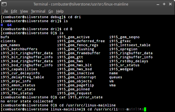 Ivan, this should clear up the terminal (I was able to see a similar font color corruption on KDE/Konsole): commit 407257570fea1c6456fda47c9fab36c39f169c2b Author: Chris Wilson <chris@chris-wilson.co.uk> Date: Sun Jun 5 15:33:27 2011 +0100 sna/gen6: Flush the pipeline before effecting a change of blend modes ... also make sure that we flush if we change the blend mode for the CA pass Reported-by: Ivan Bulatovic <combuster@archlinux.us> Bugzilla: https://bugs.freedesktop.org/show_bug.cgi?id=37946 Signed-off-by: Chris Wilson <chris@chris-wilson.co.uk> You will need to keep DEBUG_FLUSH_CACHE enabled for your current kernel to keep rendercheck happy, though you would be unlikely to see that particular corruption in practice.