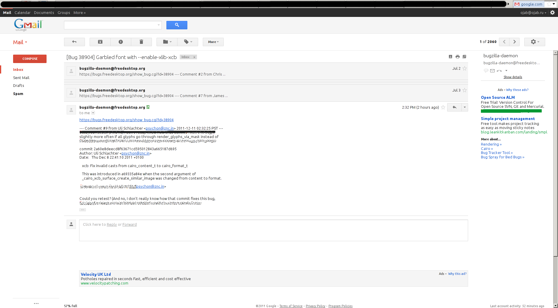 Since this also happens with xlib-xcb, the bug must be elsewhere. After having stared at the code for a while, I think that the image backend doesn't freeze the font cache and so we sometimes get a use-after-free from the resulting race. Also, the bug triggers more often with xlib-xcb if all font drawing goes through the fallback path (drawing a mask via the image backend). Reassinging to the image backend. Oh and: Can't reproduce in google mail (This was the first time I used the web interface instead of the POP server).