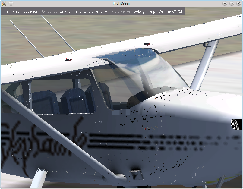 Hi there, i own a MacBook Pro 2011 which i have loaded with linux. I am trying to run the flightgear simulator (v.2.4.0 compiled from source) and i am seeing some artifacts that ruin the experience. I have attached three screenshots that show the problem. I have to say that sometimes i've managed to load the simulator and it looks great, without problem, but this starts happening, and after that, until reboot i have not managed to see it well again