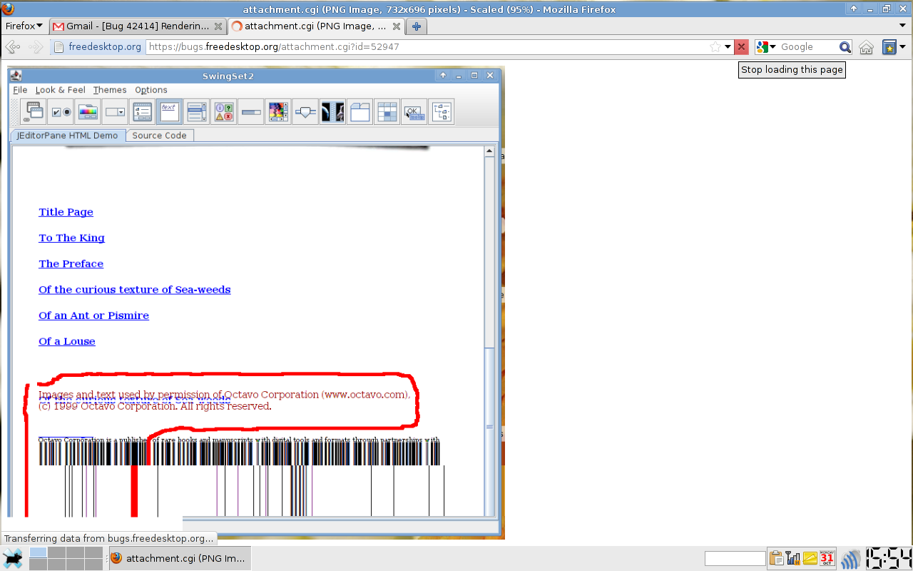 When firefox loads an image, it renders it a few times while loading, which seems to be broken with SNA. The screenshot attached shows firefox-7.0.1, displaying a partially loaded image from bugzilla. intel i945GM libdrm-2.4.27 pixman-0.23.8 linux-3.1.0 xorg 1.11.1