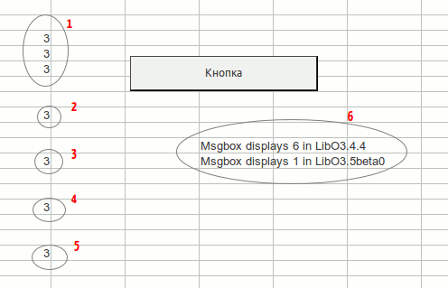 I can confirm that the results are different in 3.4.4 and 3.5.0 Your macro seems to be looking for number 3 in the whole spreadsheet (I can't confirm if your macro is correct because I'm not an expert in Basic Macros). While version 3.5.0 reports 1 result, version 3.4.4 reports 6. But there are 7 visible cells containing value 3, so both results are wrong...
