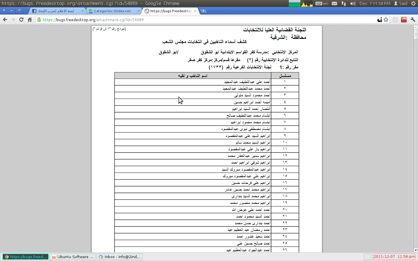 (In reply to comment #5) > I am using evince (with i guess is what you mean with "Document Viewer") in > Ubuntu 11.10 and it does not work. I installed some MS Fonts, including, since some time ago. I think it was ttf-mscorefonts-installer. So evince could able to open it. By the way, my system able to write Arabic. i.e. I have Arabic keyboard layout.