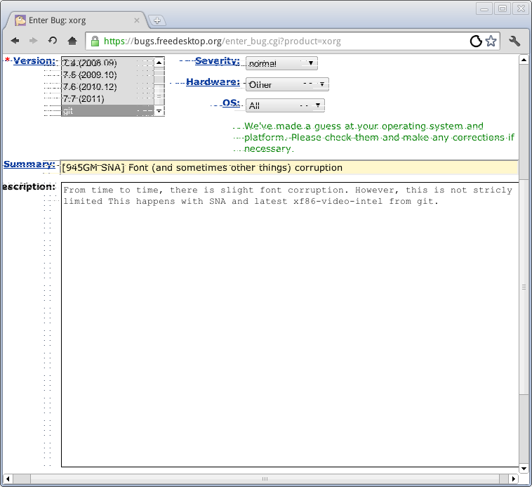 Created attachment 54314 [details] example of misrendered fonts From time to time, there is slight font corruption. However, this is not stricly limited to font rendering but also happens with GUI controls, the web page part of chromium and, for example, the LCD clock panel item in XFCE. This happens with SNA and latest xf86-video-intel from git.