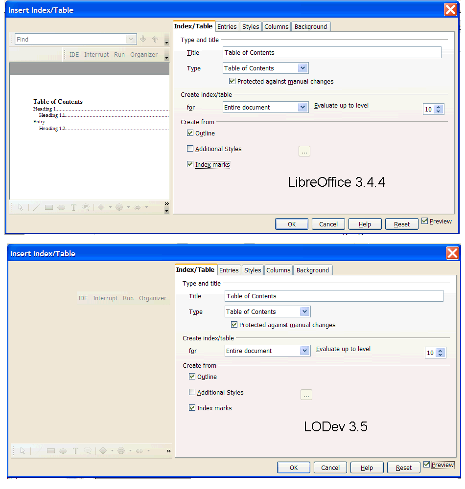 Created attachment 54865 [details] Screenshot Open die Dialog "Insert Index/Table". Uncheck "preview". The dialog shrinks. Check "preview". The dialog expands, but there is no preview. This error is new in LOdev3.5. The toolbar leftovers you see are already tracked in bug 37758. Screenshot attached.