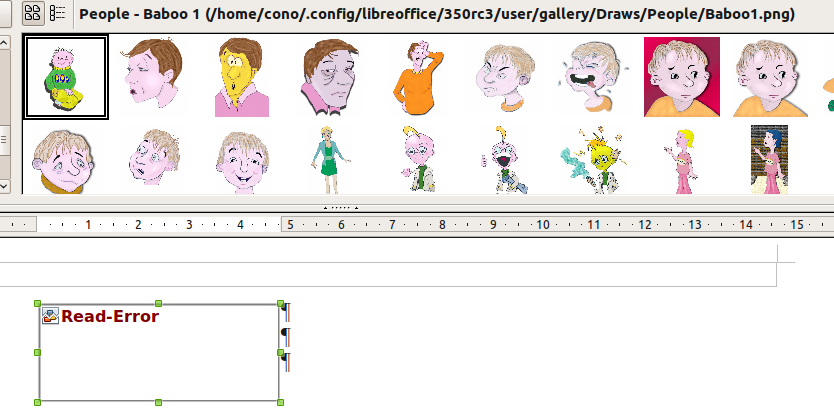 If you install gallery that contains external links (instead of embedding vector graphic) to jpeg or png files the external files can not viewed from LibreOffice. The path of such images has wrong value. For example: The real path of gallery element is: ~/.config/libreoffice/3/user/uno_packages/cache/uno_packages/lu1ik7gv.tmp_/OOOP-accessories-2.7.0.0.oxt/gallery/Draws/People/Baboo1.png after the gallery extension installation however the LibO search it in: ~/.config/libreoffice/3/user/user/gallery/Draws/People/Baboo1.png that causes uninsertable gallery element. Few users also has same problem under windows too: https://webcache.googleusercontent.com/search?q=cache:gMwf6NDaI7QJ:extensions.services.openoffice.org/project/oxygenoffice-gallery+&cd=1&hl=en&ct=clnk&client=ubuntu