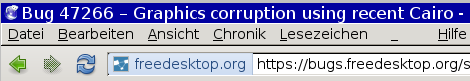 > So, does it only happen when using Cairo's new XCB backend? Originally it did, but then cairo’s xlib backend started showing the bug, too. The commit where that occurred talked about using XRENDER more completely. A test might be to compile cairo with --disable-xlib-xrender. > Yeah, it's getting rather unlikely that this is a regression. The > Cairo changes probably just exposed an existing bug. That seemed to be the diagnosis posted to cairo@ some time ago.