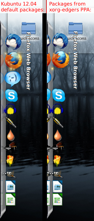 Created attachment 60981 [details] Xorg log file I am running Kubuntu 12.04, and after upgrading to the packages in the xorg-edgers PPA, some OpenGL elements are no longer rendered correctly. Among the package upgrades were: . xserver: 1.11.4 -> 1.12.1+git20120502+server-1.12-branch.ed33772a . xserver-xorg-video-intel: 2.19.0 (x-updates PPA) -> 2.19.0+git20120501.7e09babb The rendering bug can be seen with GLX-dock. I have attached a comparison screenshot where you can see the dock reflections are incorrect. and the icon below the one with focus disappears. ** My System ** OS: Kubuntu 12.04 i386 w/ KDE SC 4.8.2 PC: HP Pavilion dv1550se laptop CPU: Intel(R) Pentium(R) M processor 1.60GHz RAM: 1.5GB DDR400 Video: Mobile 915GM/GMS/910GML Express Graphics Controller Sound: 82801FB/FBM/FR/FW/FRW (ICH6 Family) AC'97 Audio Controller Linux Kernel: 3.2.0-24-generic Screen Resolution: 1280 x 768